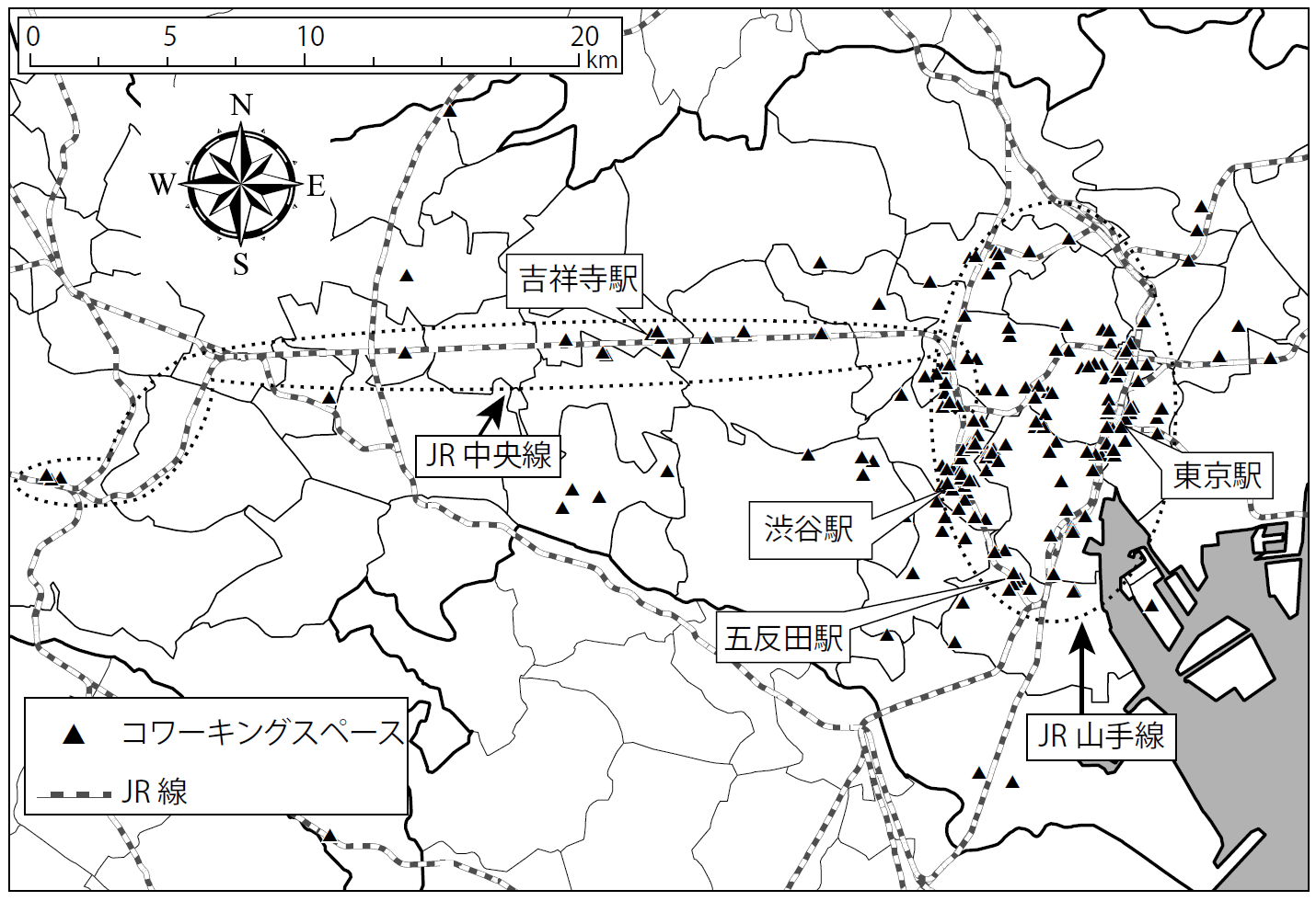山本氏が調査対象とした、東京都内のコワーキングスペースの立地。(2017年2月時点)
