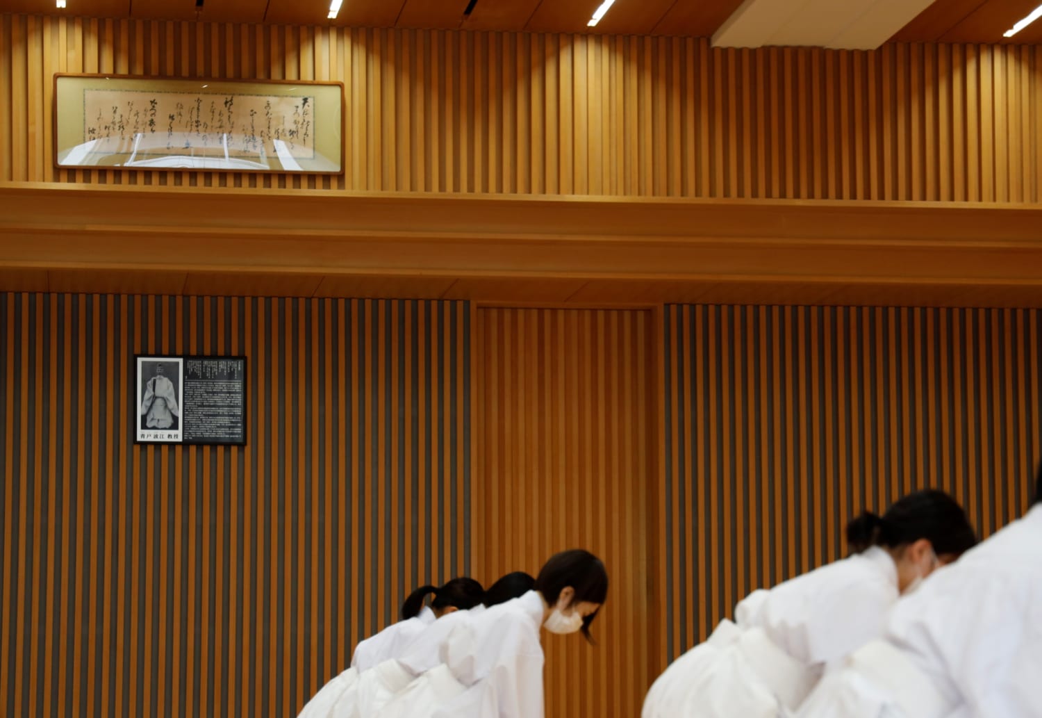 青戸直筆の扁額と祭式の授業に臨む学生たち