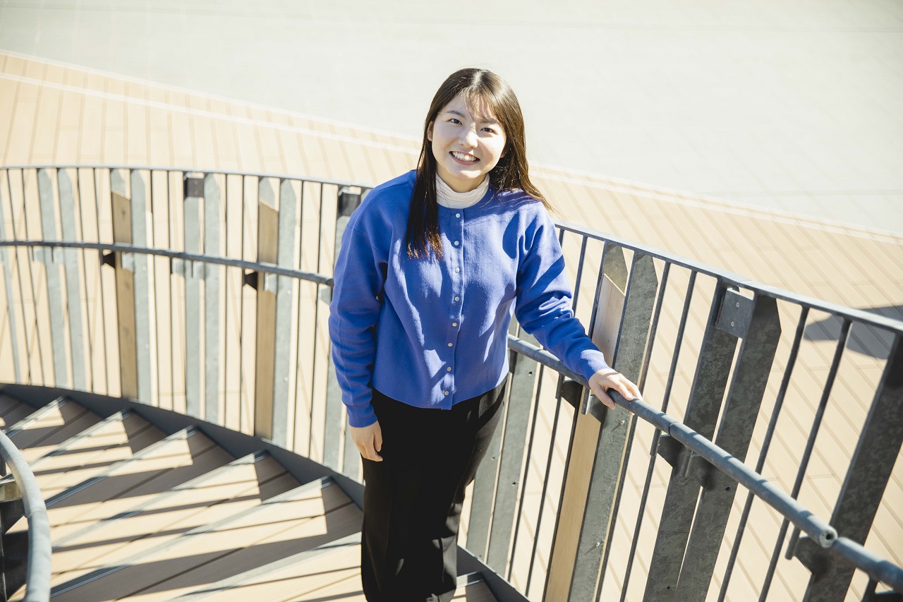 お日様みたいに明るい笑顔が印象的な久保田結菜さん。高校の時から「小学校の先生になりたい!」と目標を定めていた。入学後は、教育に関係するさまざまなボランティア活動に邁進してきた。