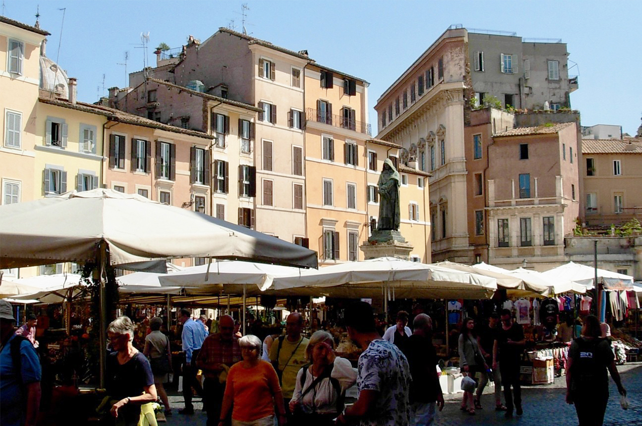 ブルーノが火炙りになったローマの広場カンポ・デ・フィオーリは、現在は市場として賑わう。中央にはブルーノの銅像が建っている。[岡本源太撮影]