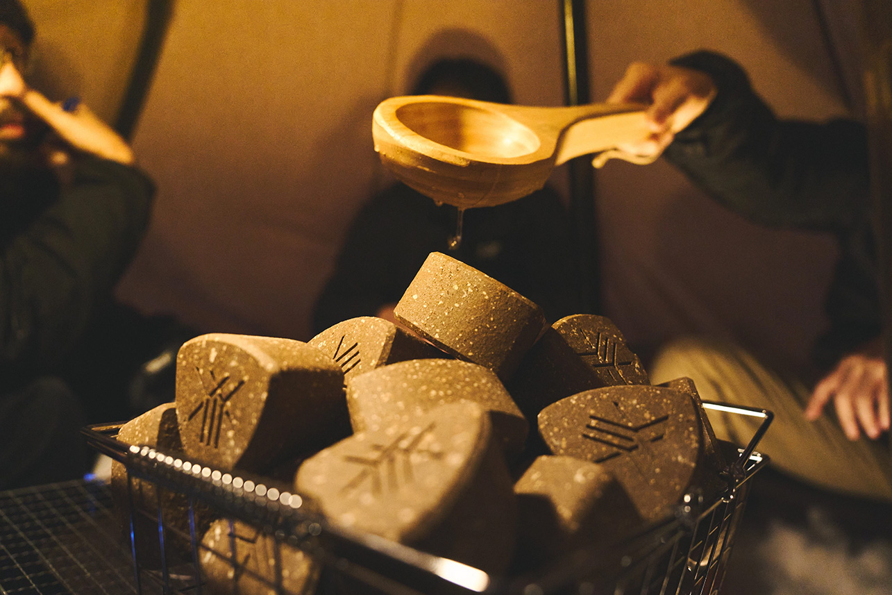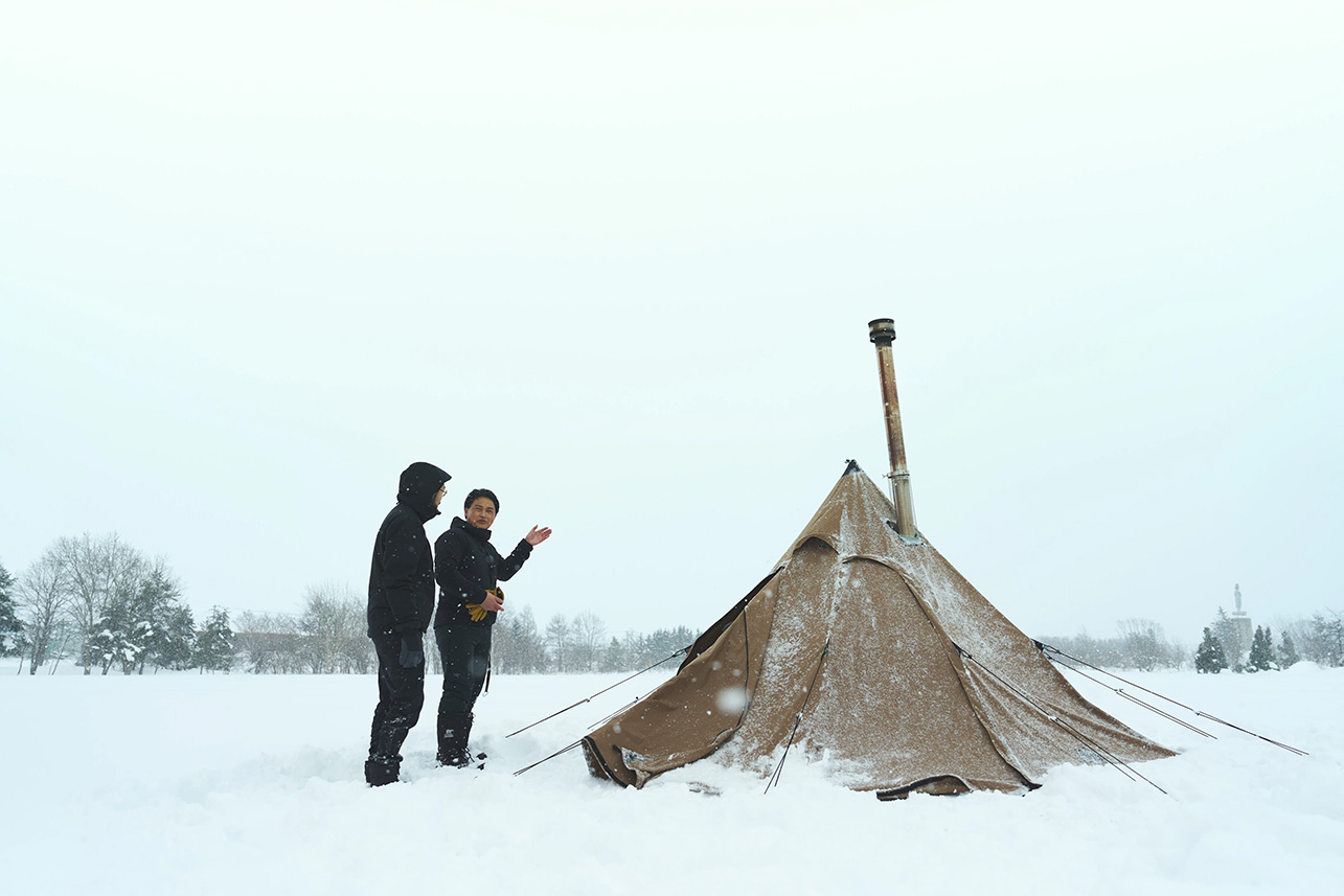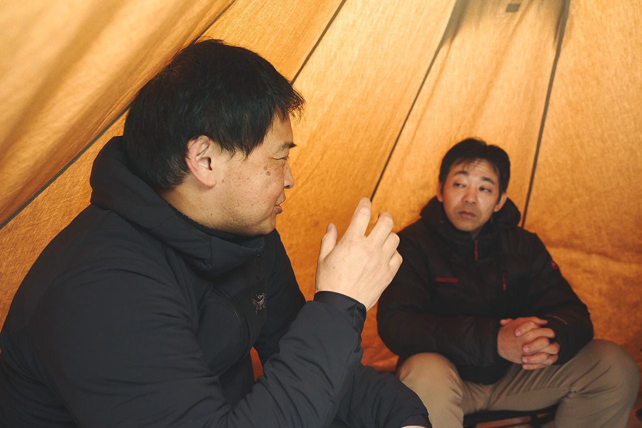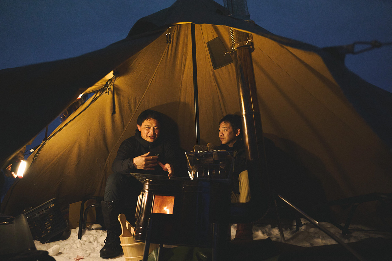 外の気温はマイナス13度。本州のそれとは違う、ふわっとした軽い質感の雪が断続的に降っています。けれどもテントの中に入ると、むしろ暑いくらい。