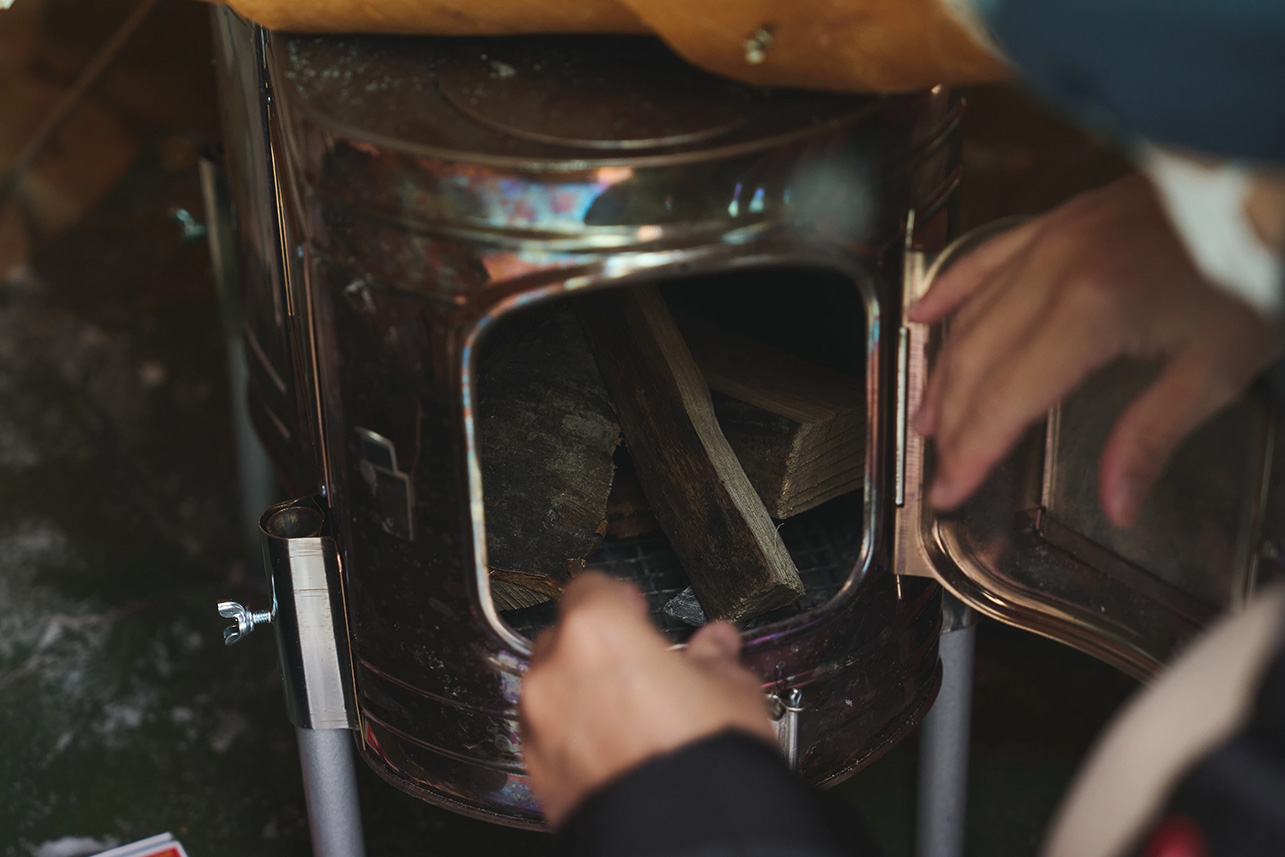 ステンレス製の薪ストーブを組み立て、中に薪をくべる。「キャンパスでとってきた」というシラカバの木の皮が優秀な働きをし、あっという間に火がつきました。