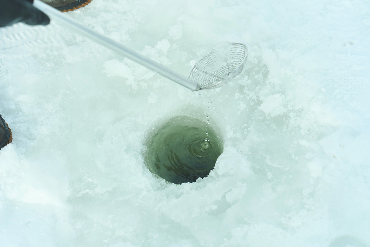 貫通した後も、ドリルを何度か出し入れし、バリが無くなるように滑らかな穴にし丁寧に氷をすくいます。この作業を怠ると、釣り糸が引っかかって切れてしまう原因になるのだそう。こうしたちょっとしたコツを熟練者が案内してくれることが、初心者にとっての「いい体験」を演出してくれます。