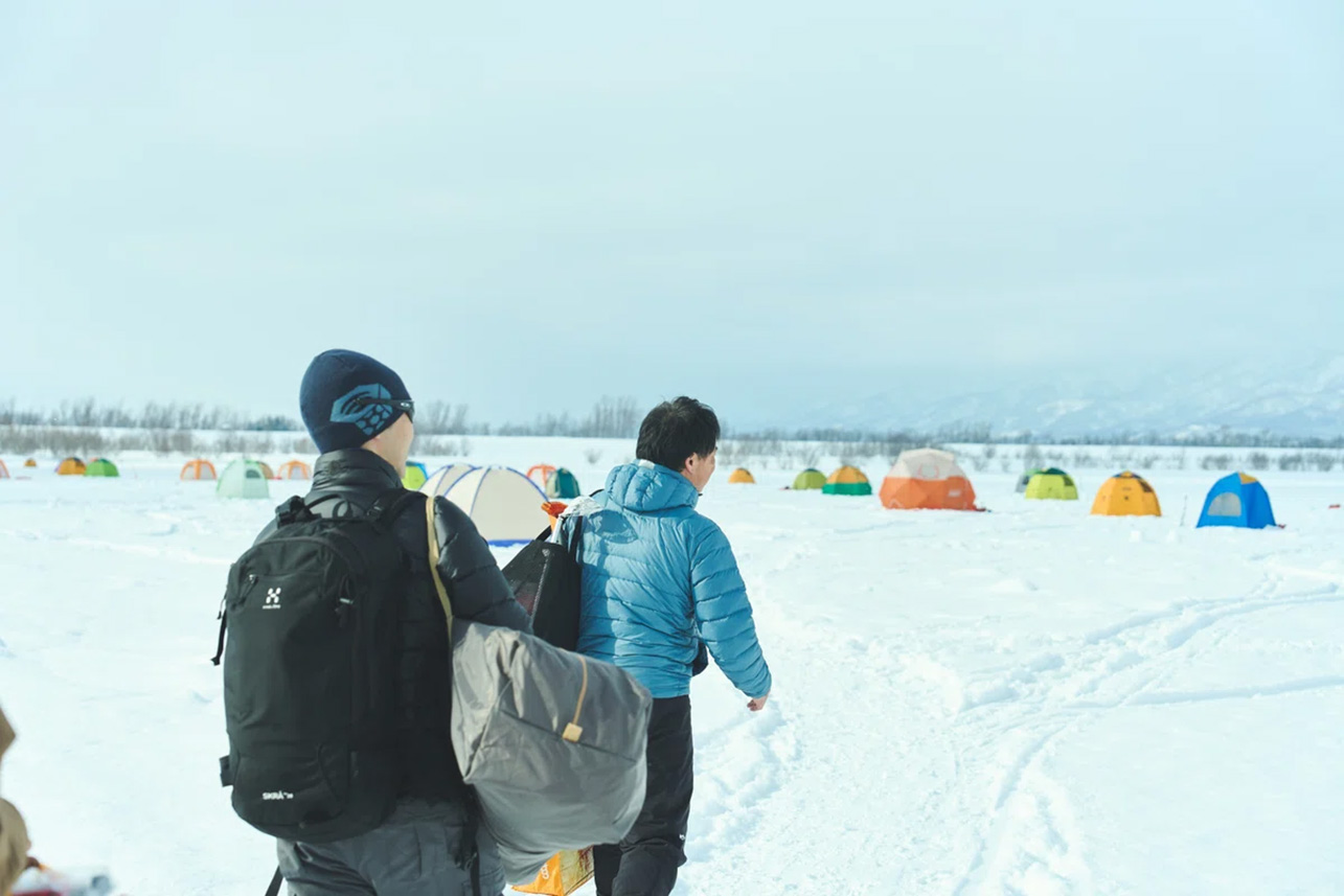まずは場所を決めるところから。雪を踏み固めて平らにし、テントを張るスペースを作ります。とはいえ、先客のテントはあちこちに散らばっていて、素人にはまったく法則性が見えません。こうもだだっ広い湖の、一体どこに張るのが良いのでしょうか。