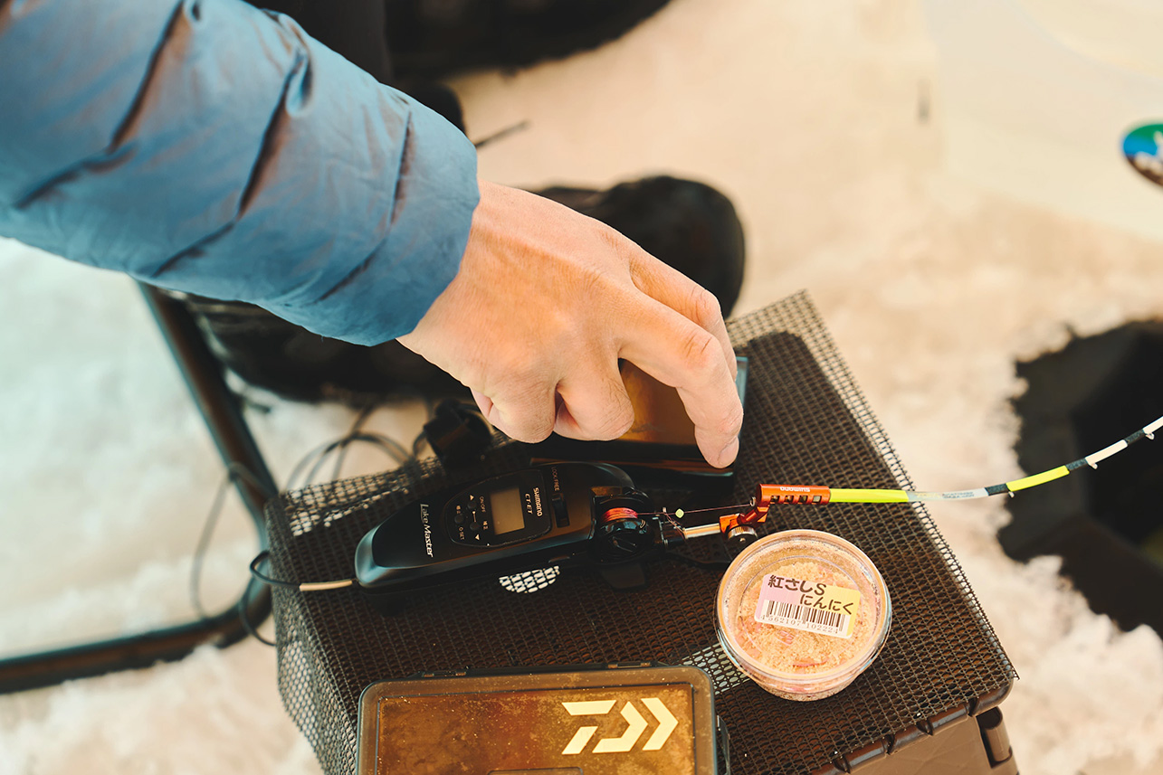 言うが速いか、さっそく先陣を切って糸を垂らす田中先生。用いるのは、ボタン一つで糸を巻き上げられる電動リールです。モバイルバッテリーを携行しており、長期戦になっても安心。デジタルカウンターを見れば、ワカサギ釣りの仕掛けがどの深さにあるのかも一目瞭然にわかります。