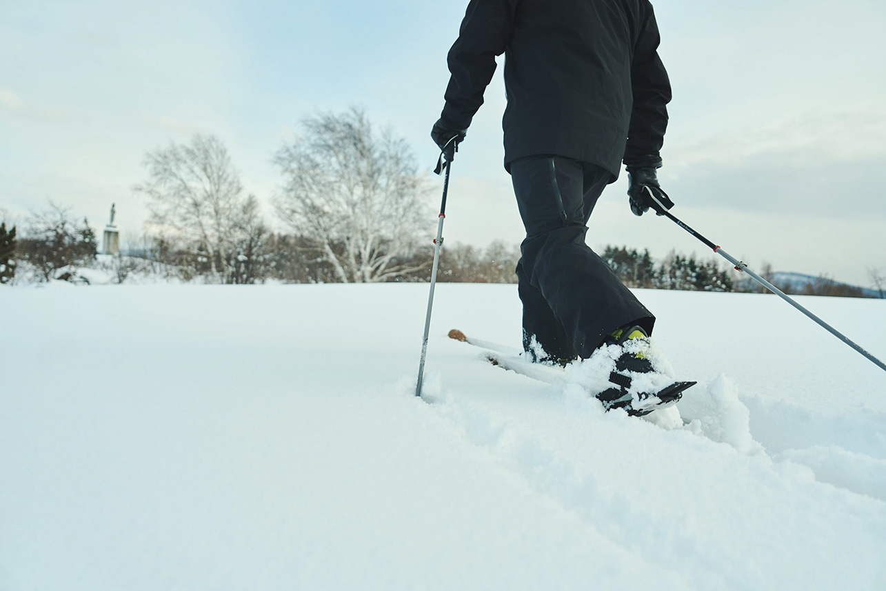 当日はキャンパス内で「スノーハイク」と呼ばれるショートスキーも楽しんだ。足を上げなくても動けるため、雪の上を歩くのと比べてはるかに省エネ。夏は藪に覆われた場所も、雪のある冬なら容易に行ける。お手軽だが、冬ならではの自然の楽しみ方の一つだ