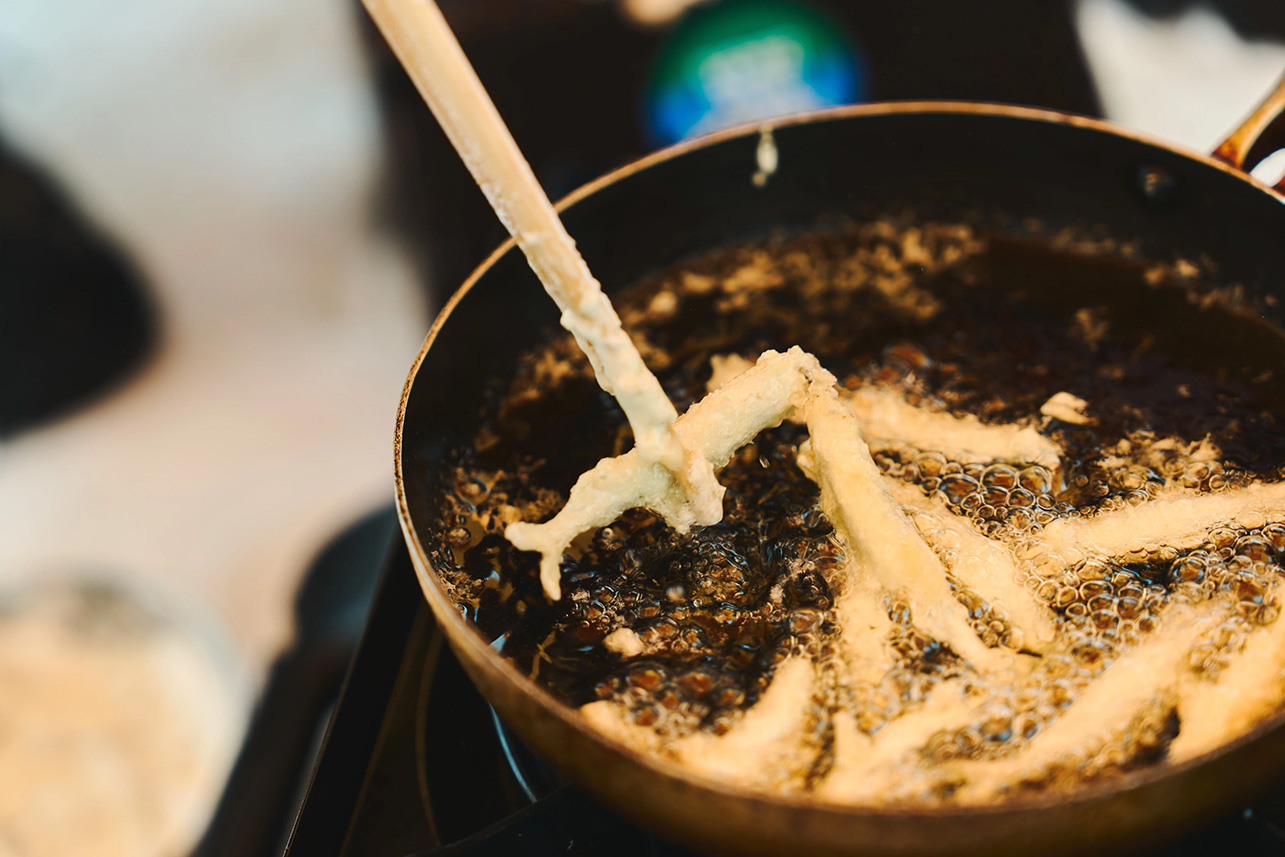 釣りたてのワカサギは塩でヌメリをとってから粉をまぶし、そのまま用意していた鍋で天ぷらに。これがまたサクサクしていて美味い! まるでマクドナルドのポテトのような勢いで、各自の手が伸びる、伸びる……。いくらでも食べられそうな美味しさですが、毎日来ている人からすると、やはり受け止め方が違うのでしょうか。
