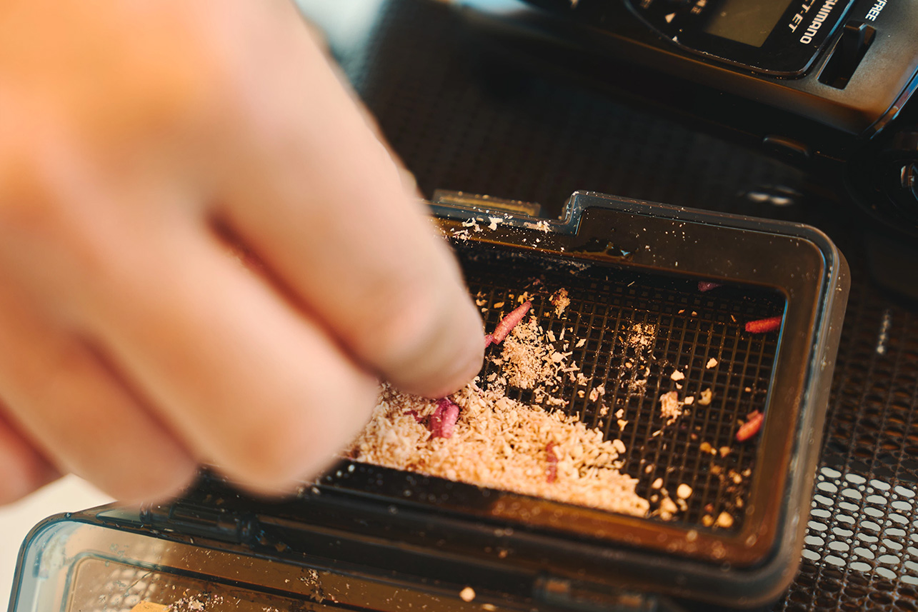 今回使用する餌は、ニンニクの香りのついた紅色のウジムシ、通称「ベニサシ」。仕掛けは滝川の釣具店のオススメ品を田中先生が独自にアレンジしたものだそう。「間違いなく釣れますので、ご心配なく」という田中先生の太鼓判が、青木先生にとっては逆にプレッシャーとしてのし掛かります。