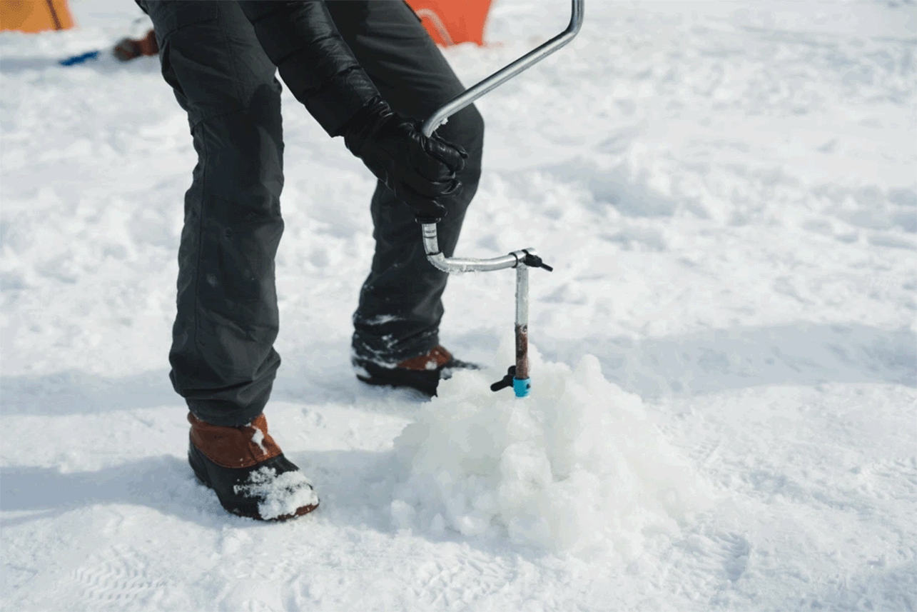 次は専用のアイスドリルを使って氷上に穴を開ける作業です。やってみるとこれが意外に力仕事で、氷点下というのに、すぐに汗だくになってしまいます。腰を入れ、しばらく単調な作業を続けていると、ゴリっという音とともに手応えが。ようやく貫通したようです。