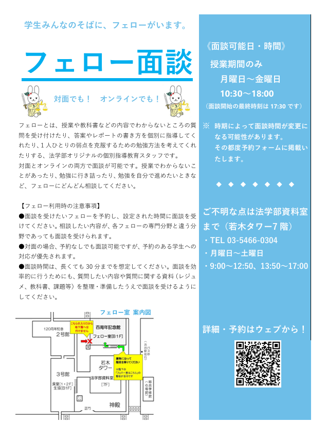 法律学の科目では、抽象的な議論が授業の初回から頻出し、戸惑っているうちに先へ進んでしまうことが少なくありません。憲法や行政法もその傾向があります。テストや資格試験の問題を見ても何が聞かれているか、何を書けばいいのかが分からない、そんな時には是非フェロー室をご利用ください。共に考え、「分からない」を「分かる」へと繋げるお手伝いができれば幸いです。