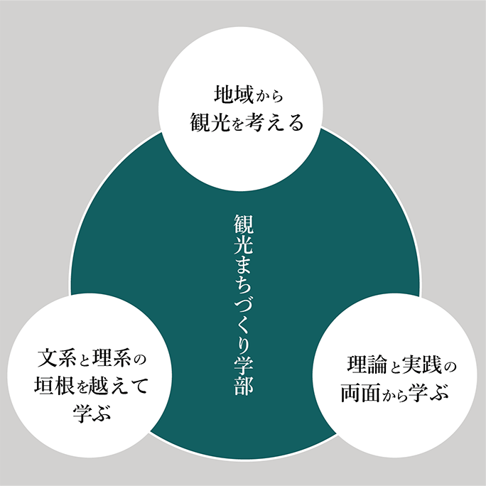 観光まちづくり学部の教育の柱を、私たちは上記の短いフレーズで表現しています。この表現で私たちは、「地域を見つめる」ことと「地域を動かす」ことを、教育を通して同時に学生諸君に伝えたいと考えています。