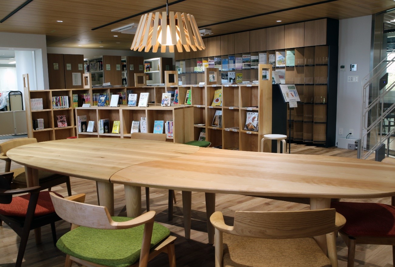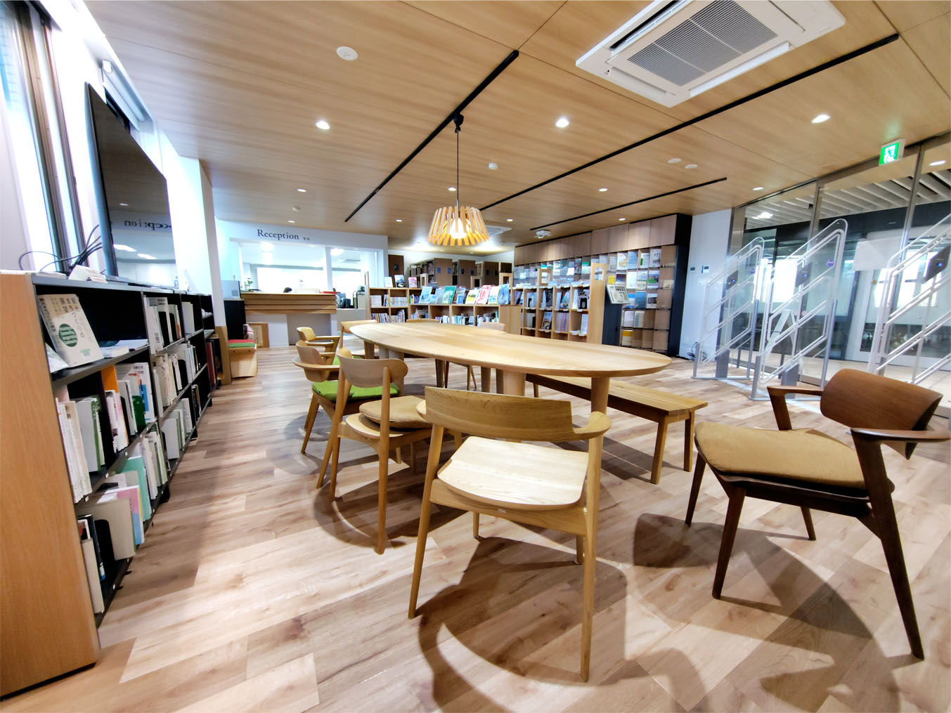 館内の大きなテーブルと椅子、一部の書棚は、岐阜県高山市の飛騨家具メーカーの製品。無垢の木に触れながら、観光まちづくりにおける地場産業の大切さを感じてください