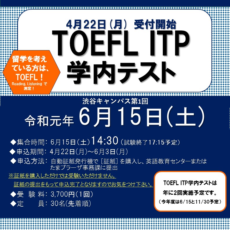 英語教育センターでは、令和元年6月15日に第1回 TOEFL ITP学内テストを実施いたします。