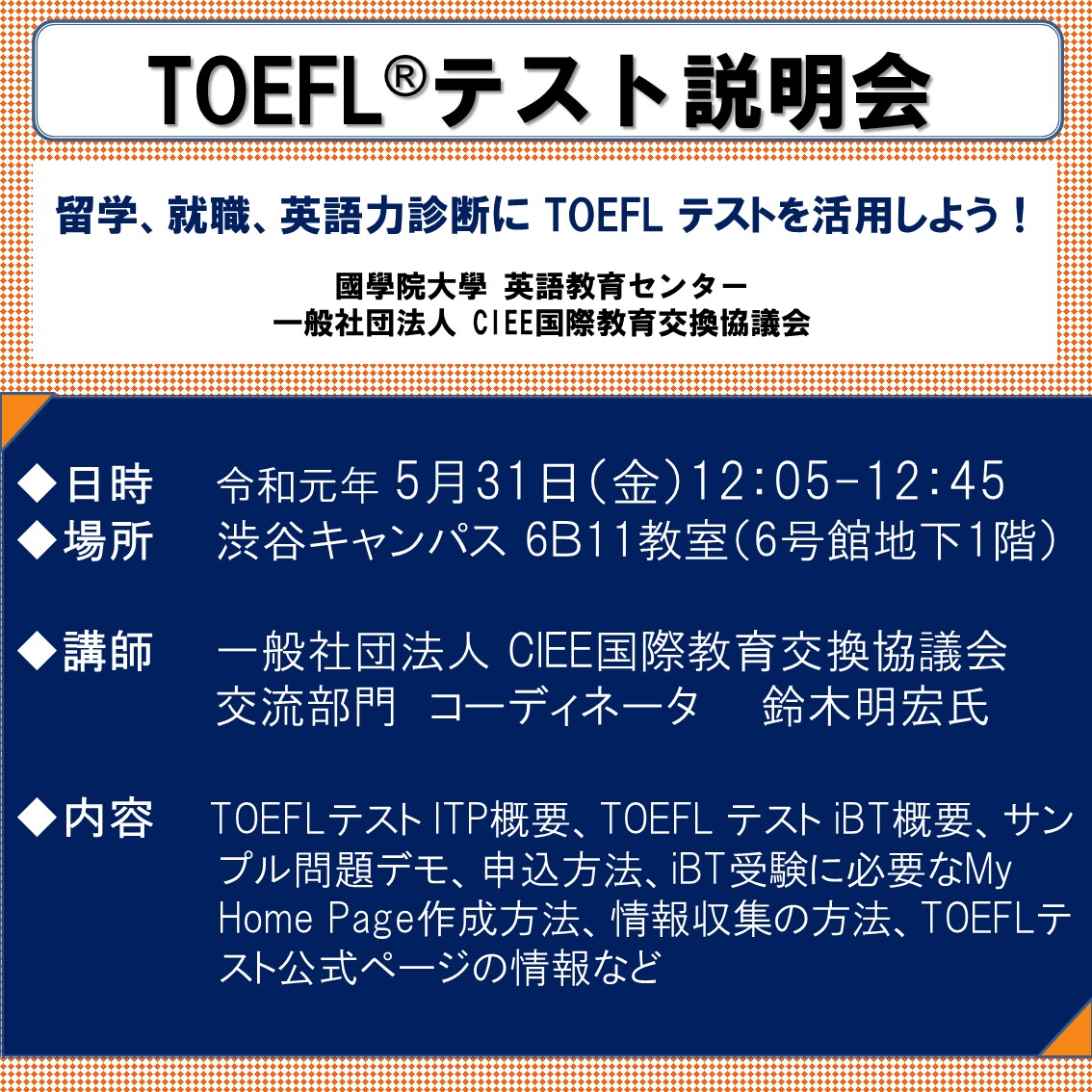 英語教育センターでは、令和元年5月31日(金)昼休みに英語能力試験のTOEFLテスト説明会を行います。