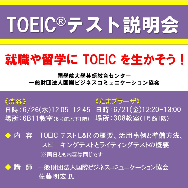 英語教育センターでは、令和元年6月26日(水)昼休みに渋谷キャンパス、21日(金)昼休みにたまプラーザキャンパスにおいて、英語能力試験のTOEICテストの説明会を行います。