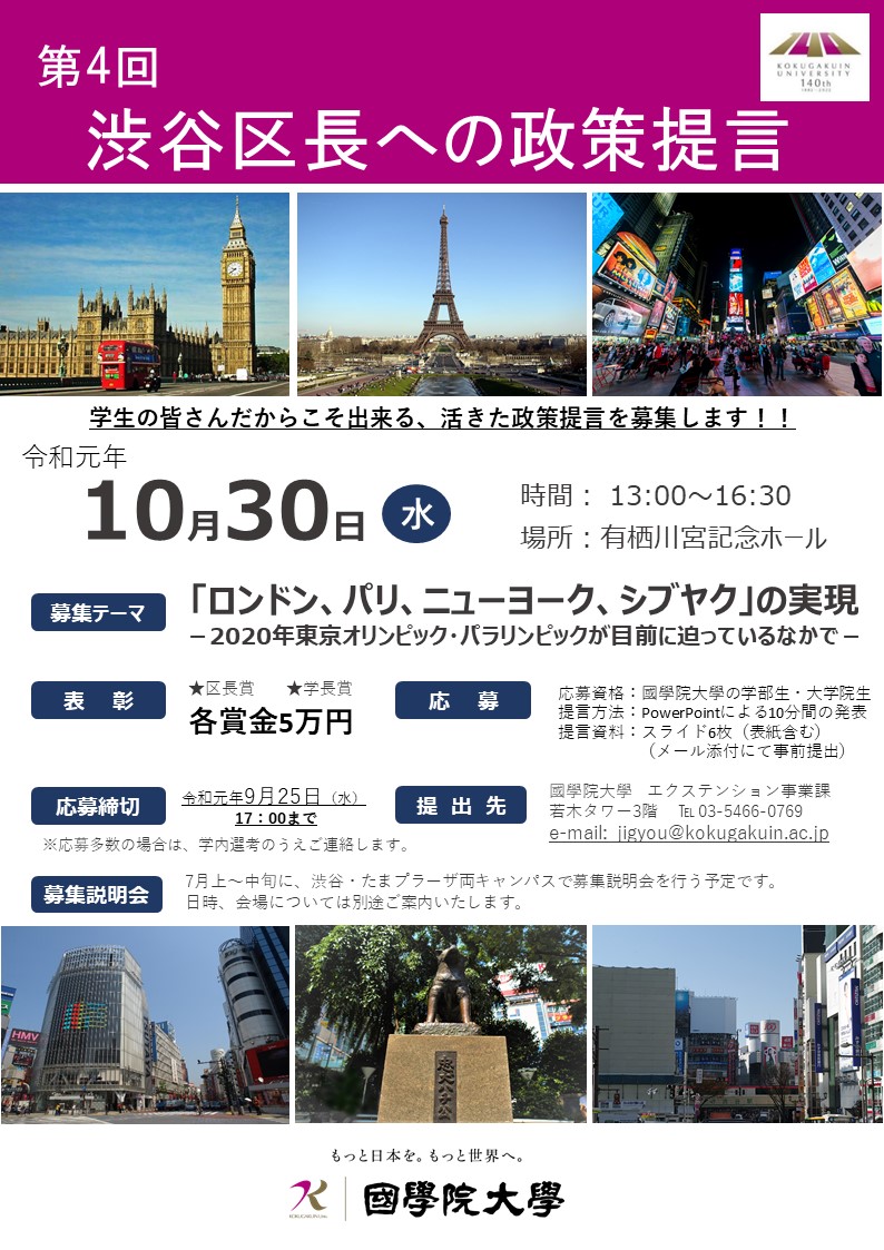 渋谷区との連携協力に関する基本協定に基づき、本学学部生、大学院生の皆さんを対象に、渋谷区長への政策提言を募集します。渋谷区長に直接提案できる貴重な機会ですので、奮ってご応募ください。