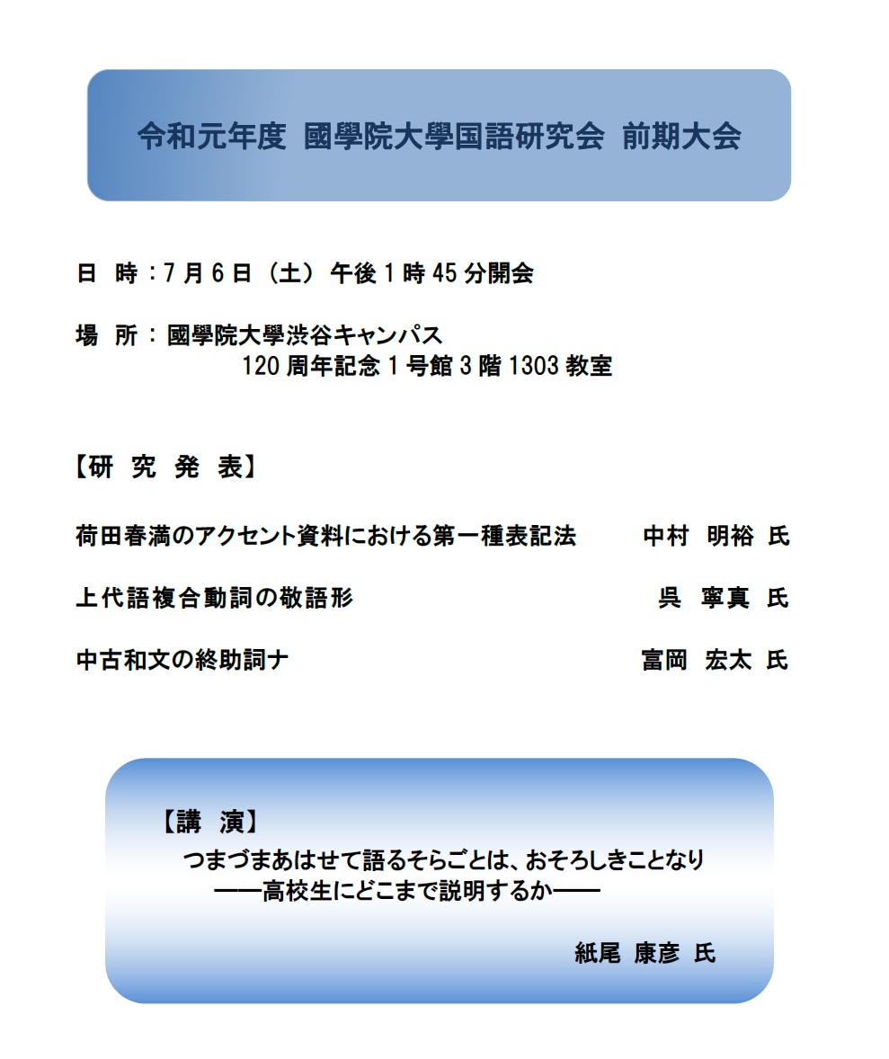 下記の通り、令和元年度國學院大學国語研究会前期大会を開催いたします。