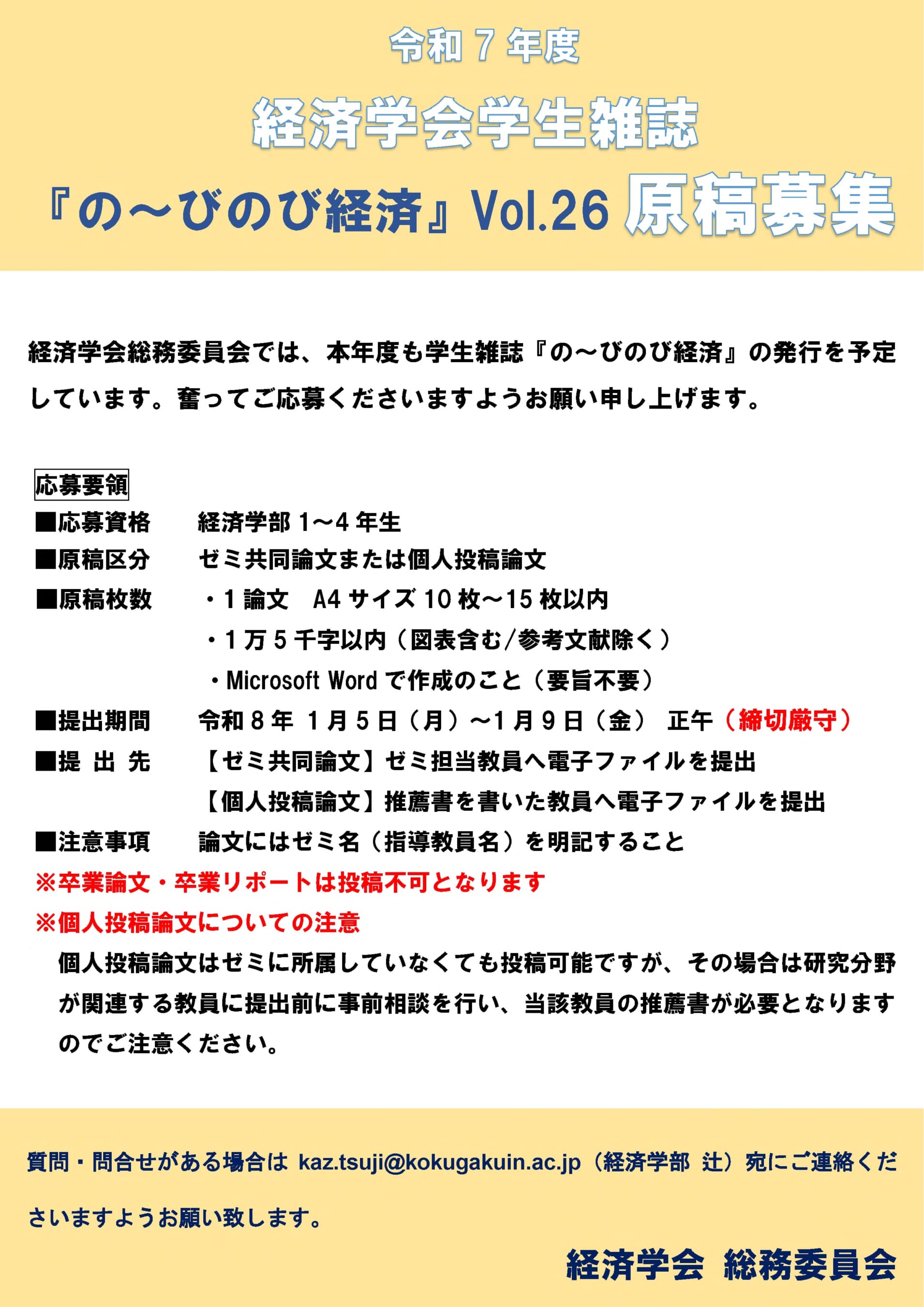 経済学会総務委員会では、本年度も学生雑誌『の~びのび経済』 Vol.26の発行を予定しています。奮ってご応募くださいますようお願い申し上げます。