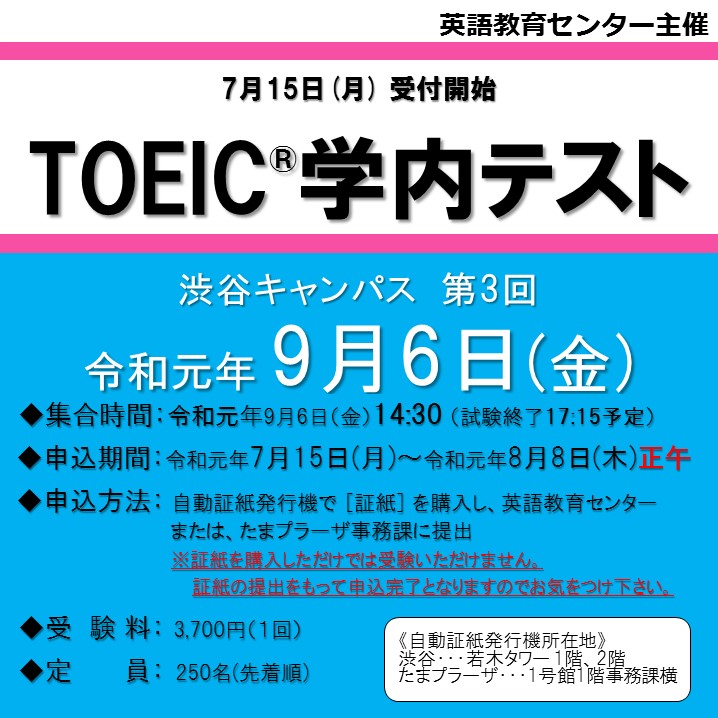 | 申込期間 | 令和元年7月15日(月)~令和元年8月8日(木)正午 ※自動証紙発行機で「R元年度TOEIC学内テスト(9/6渋谷)」の証紙を購入し、下記提出先へ提出してください。 ※証紙購入方法は、本ページ下部参照 |