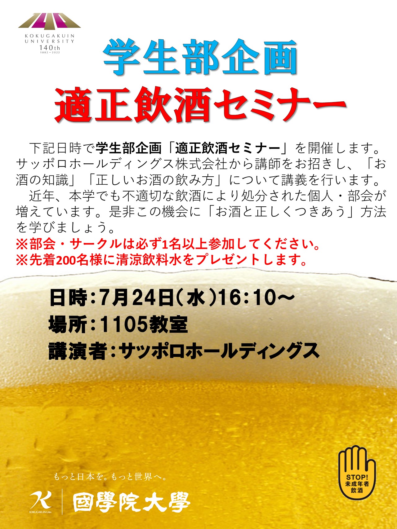 下記日時で学生部企画「適正飲酒セミナー」を開催します。サッポロホールディングス株式会社から講師をお招きし、「お酒の知識」「正しいお酒の飲み方」について講義を行います。近年、本学でも不適切な飲酒により処分された個人・部会が増えています。是非この機会に「お酒と正しくつきあう」方法を学びましょう。