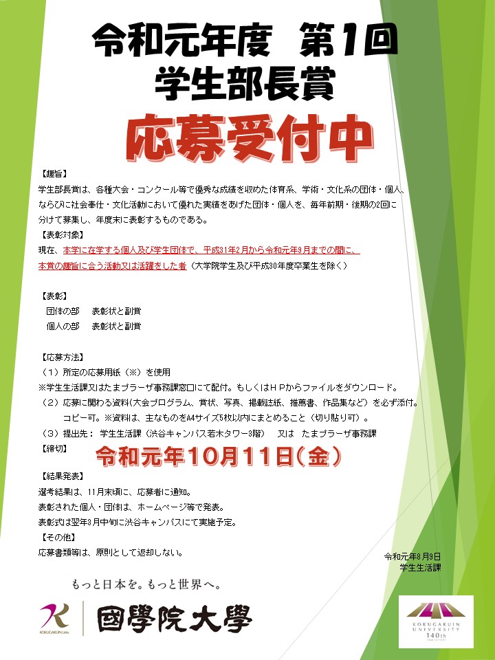 学生部長賞は、各種大会・コンクール等で優秀な成績を収めた体育系、学術・文化系の団体・個人、
