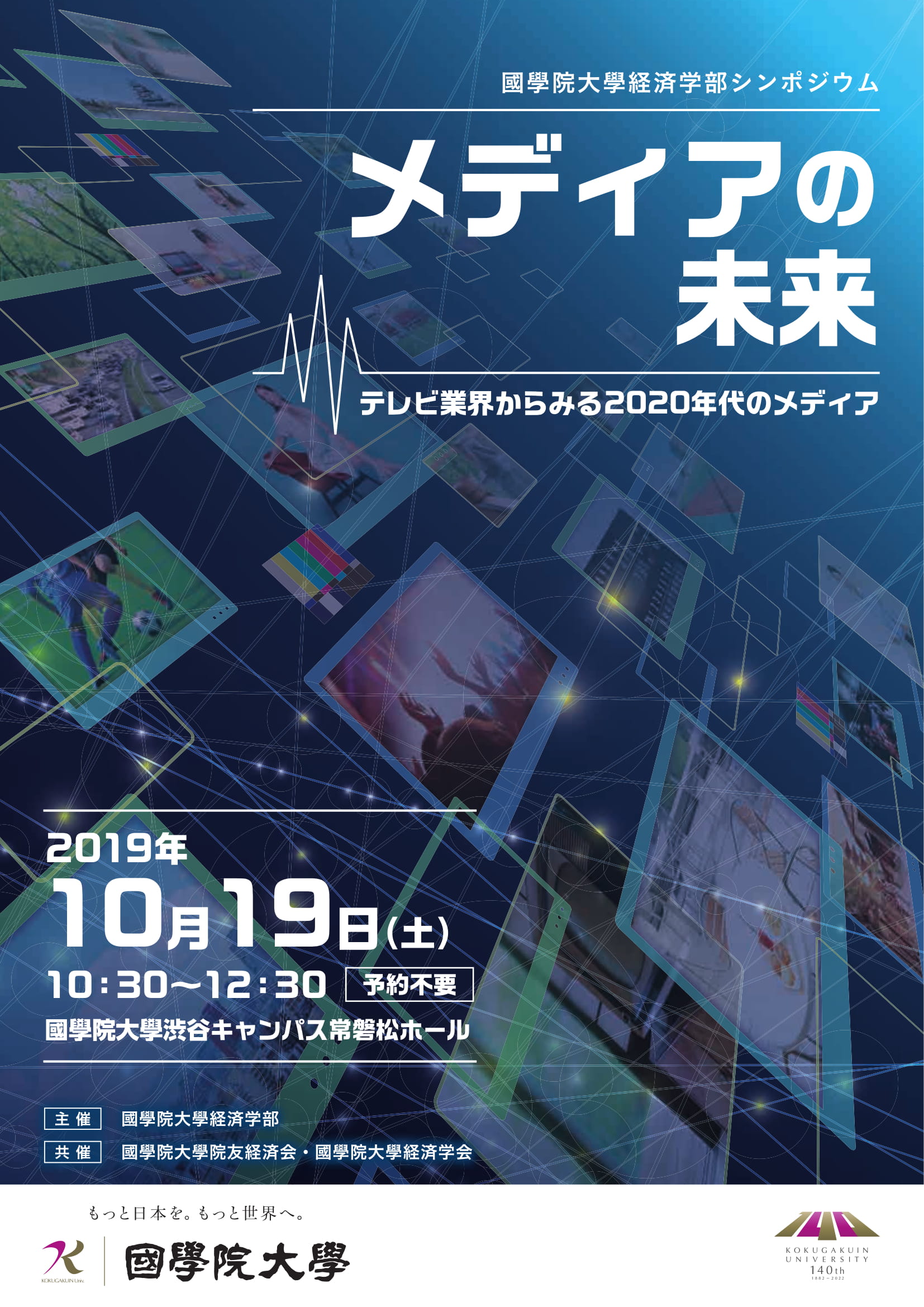 経済学部では、10月19日(土)のホームカミングデーに、國學院大學院友経済会、國學院大學経済学会と共催で、経済学部シンポジウムを実施します。本年度のテーマは、私たちの日常生活に身近な“メディア”です。
