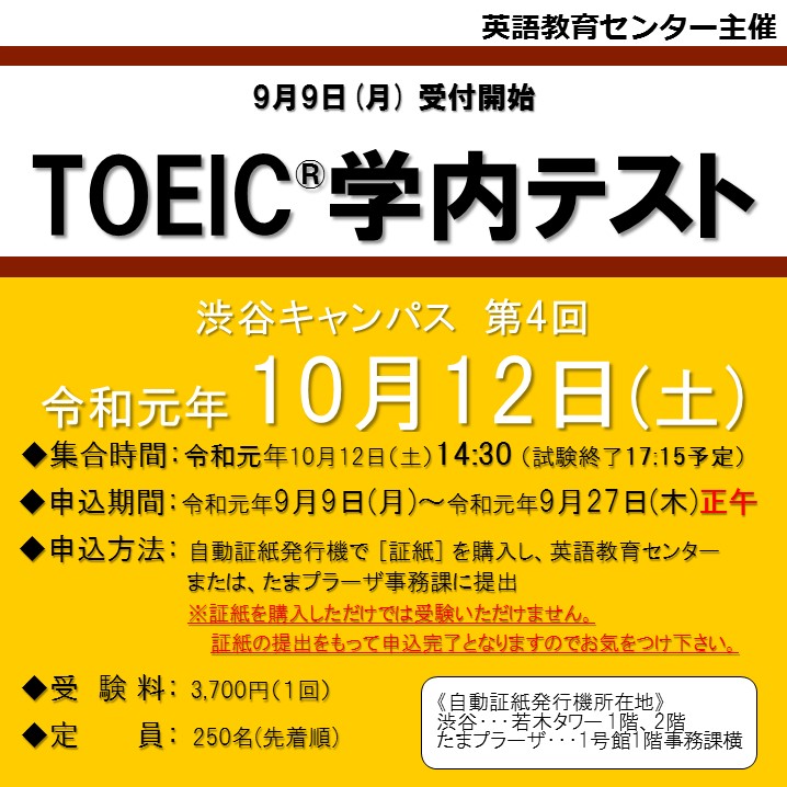 | 申込期間 | 令和元年9月9日(月)~令和元年9月27日(金)正午 ※自動証紙発行機で「R元年度TOEIC学内テスト(10/12渋谷)」の証紙を購入し、下記提出先へ提出してください。 ※証紙購入方法は、本ページ下部参照 |