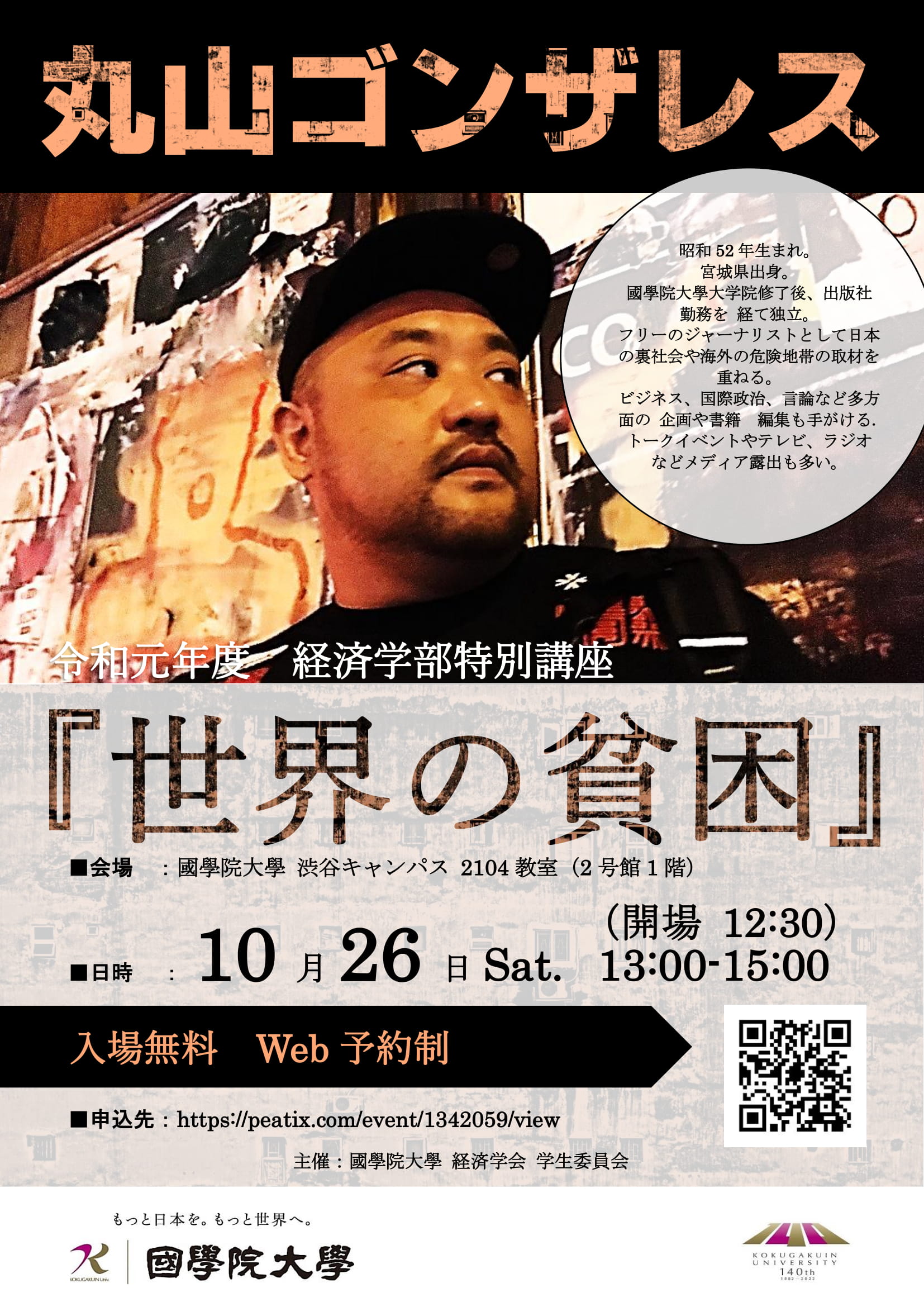 経済学会学生委員会は、10月26日(土)に、本学卒業生でジャーナリストの丸山ゴンザレス氏を招き、経済学部特別講演会を実施します。