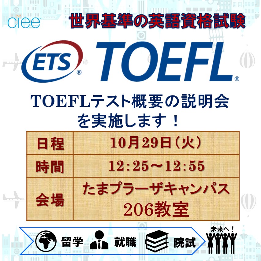 英語教育センターでは、令和元年10月29日(火)昼休みに英語能力試験のTOEFLテスト説明会を行います。