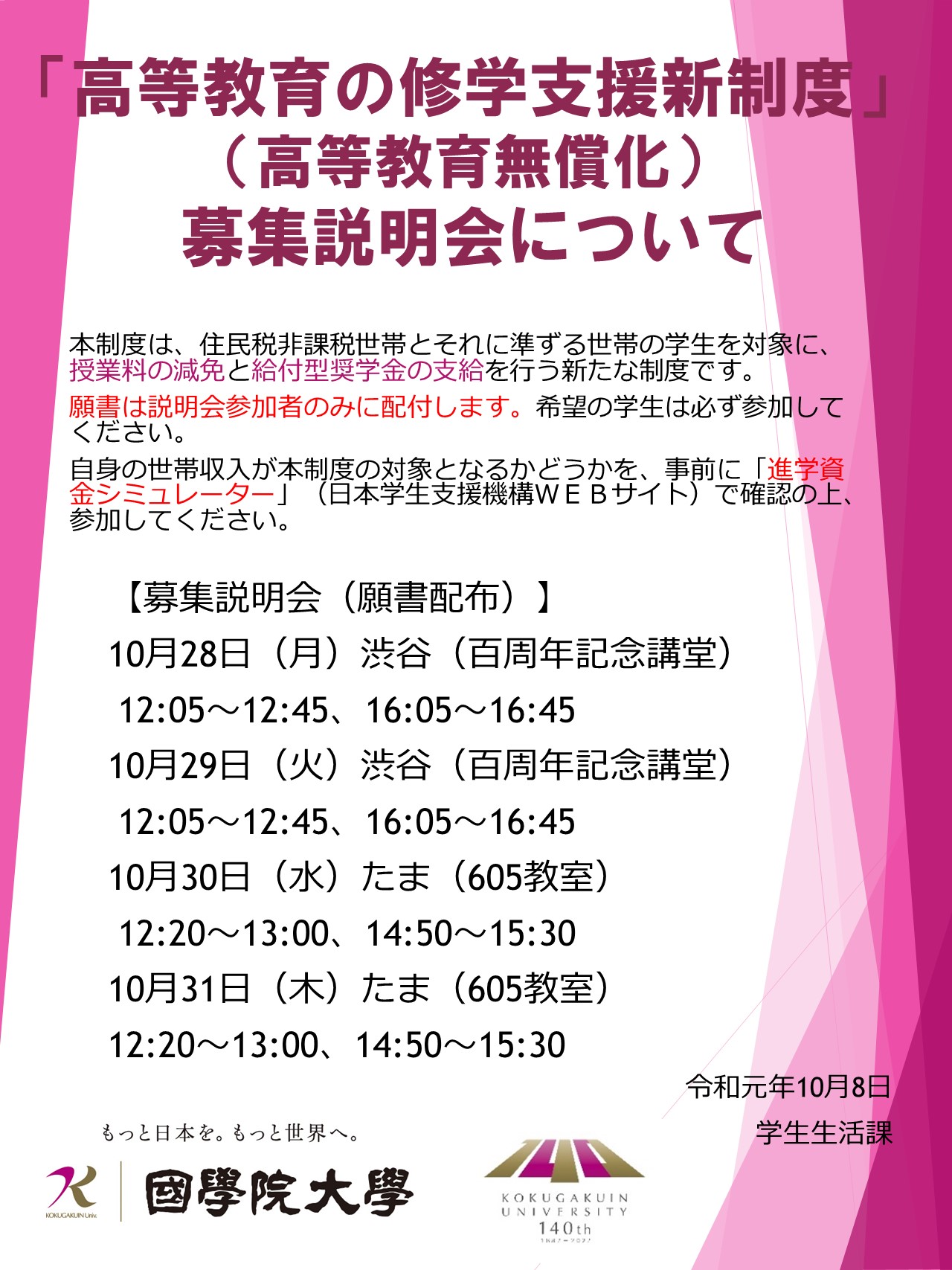 来年4月より実施する「高等教育の修学支援新制度」(高等教育無償化)の募集説明会(在学予約方式)を下記のとおり実施いたします。