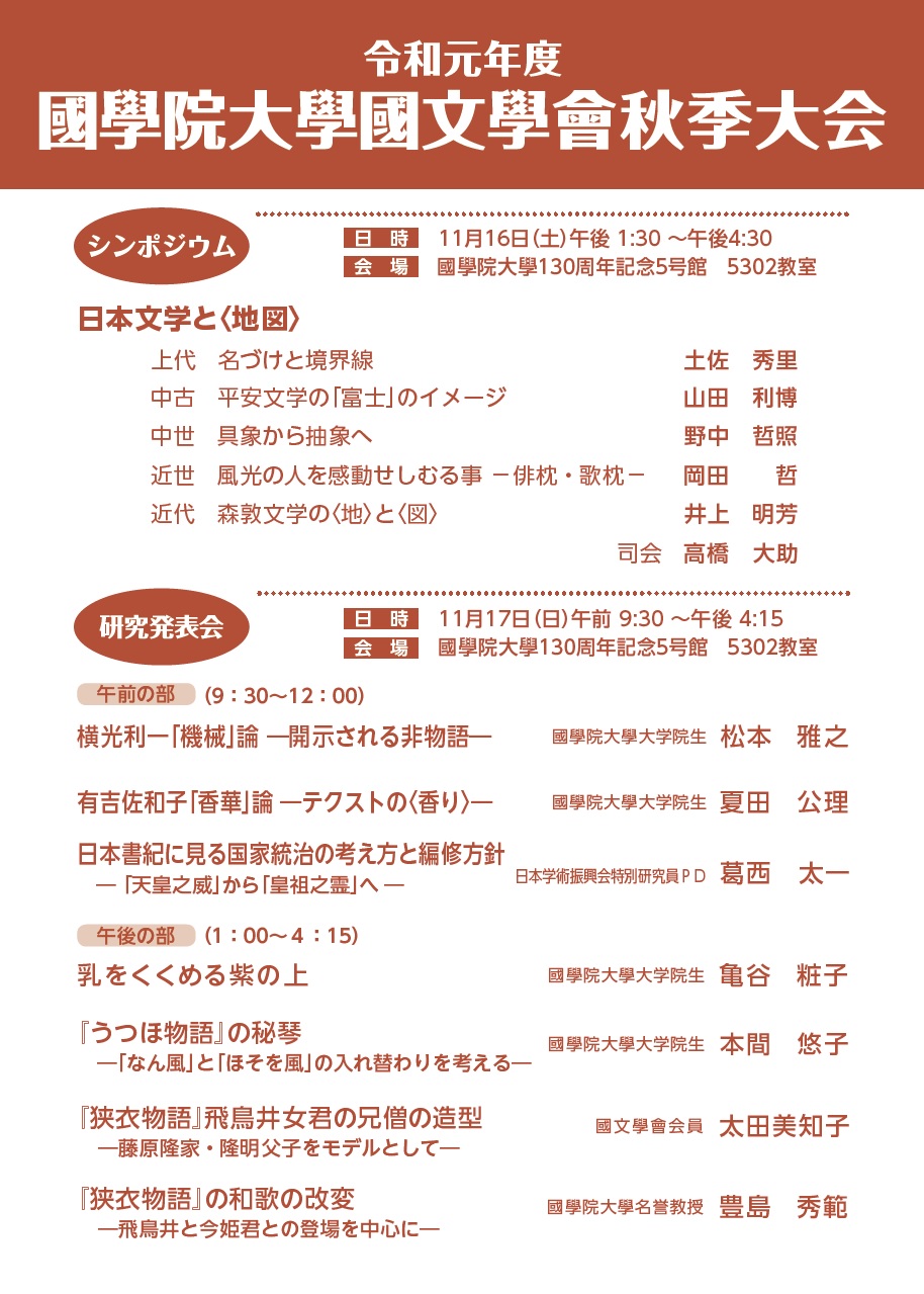 下記の通り、令和元年度國學院大學國文學會秋季大会を開催いたします。