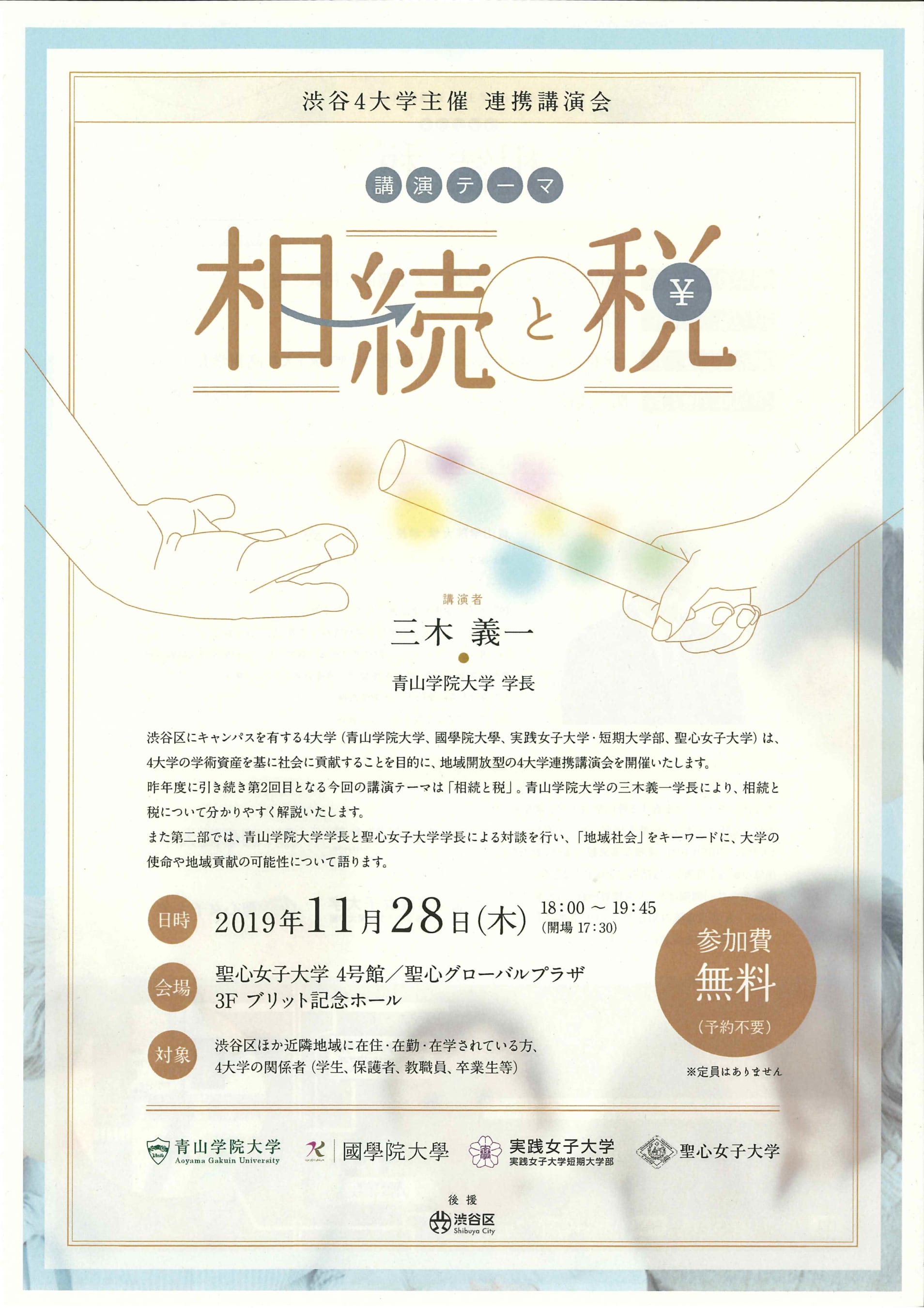 この度、「相続と税」をテーマとして、青山学院大学の三木義一学長による4大学連携講演会を開催いたします。また、講演終了後に三木学長と聖心女子大学の高祖学長による対談も企画しておりますので、多くの皆様のご参加をお待ちしております。