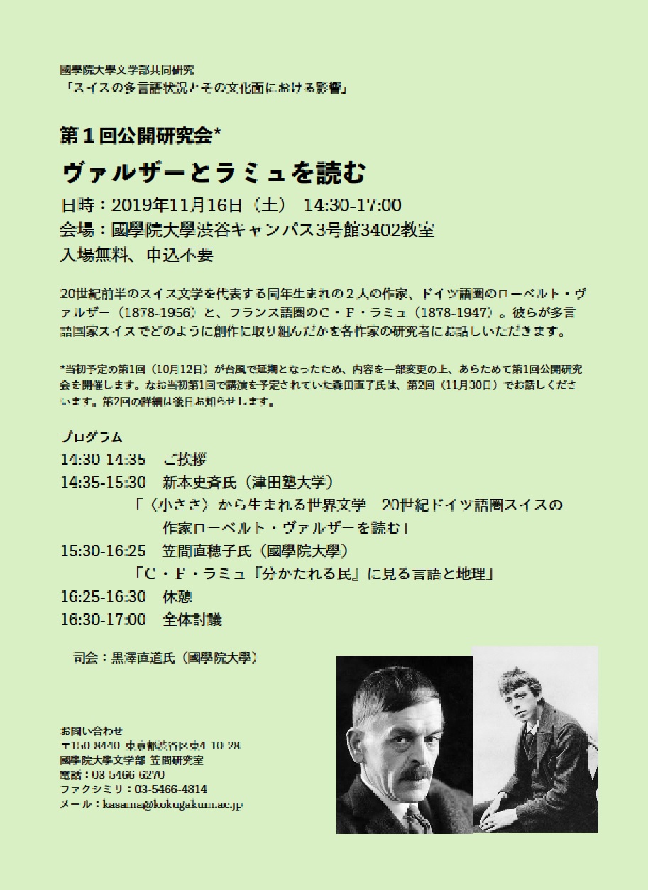 20世紀前半のスイス文学を代表する同年生まれの2人の作家、ドイツ語圏のローベルト・ヴァルザー(1878-1956)と、フランス語圏のC・F・ラミュ(1878-1947)。彼らが多言語国家スイスでどのように創作に取り組んだかを各作家の研究者にお話しいただきます。