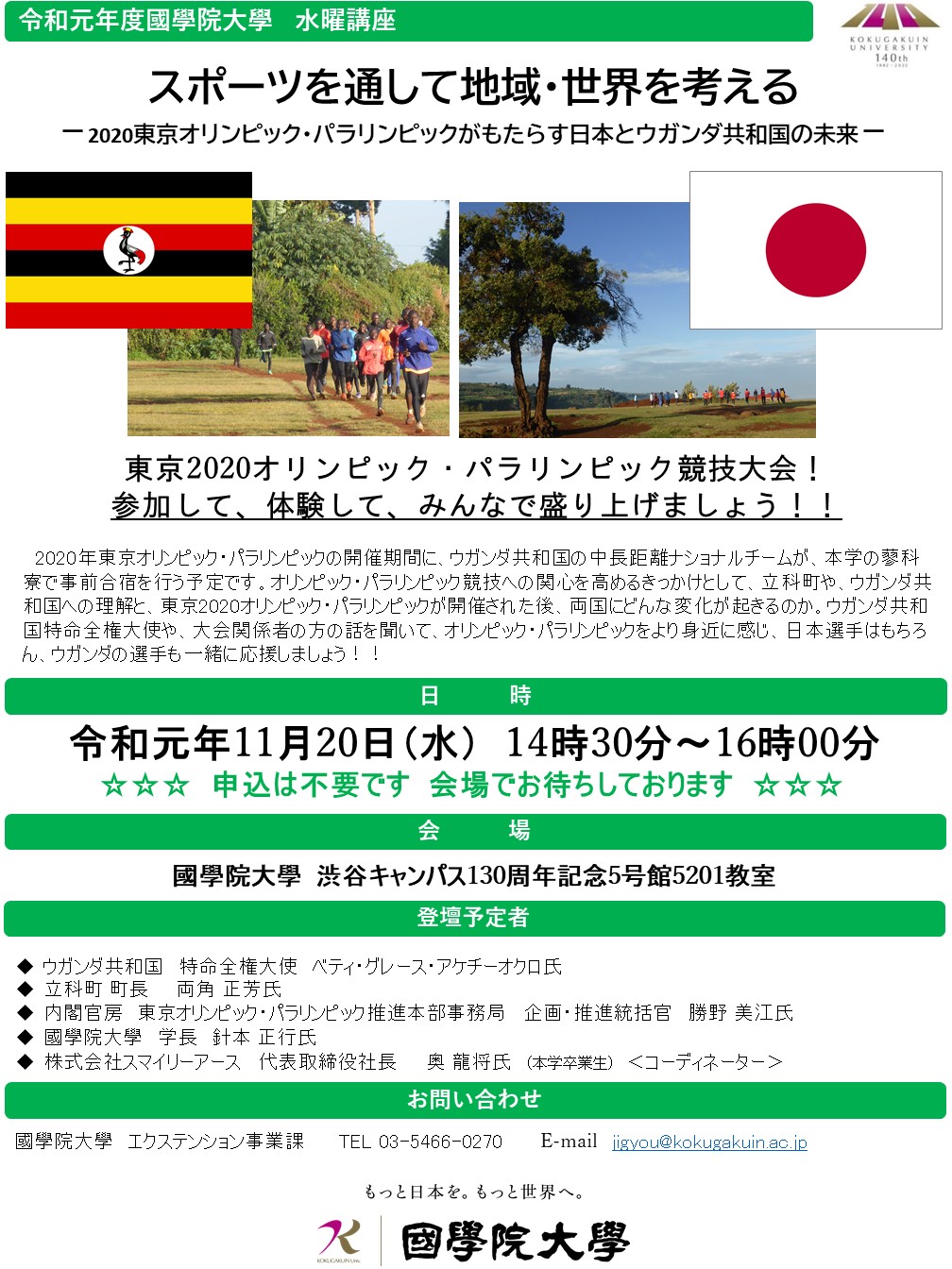 | 講師 | ウガンダ共和国 特命全権大使 ベティ・グレース・アケチーオクロ氏、立科町長 両角 正芳氏、内閣官房 東京オリンピック・パラリンピック推進本部事務局 企画・推進統括官 勝野 美江氏、國學院大學 針本 正行学長、株式会社スマイリーアース 代表取締役社長 奥 龍将氏(本学卒業生、コーディネーター) |
