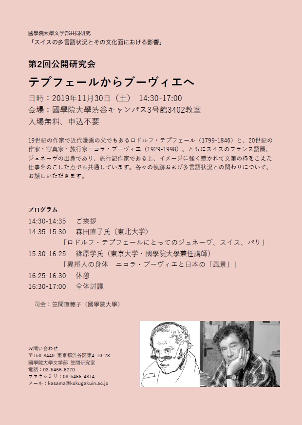19世紀の作家で近代漫画の父でもあるロドルフ・テプフェール(1799-1846)と、20世紀の作家・写真家・旅行家ニコラ・ブーヴィエ(1929-1998)。ともにスイスのフランス語圏、ジュネーヴの出身であり、旅行記作家である上、イメージに強く惹かれて文筆の枠をこえた仕事をのこした点でも共通しています。各々の軌跡および多言語状況との関わりについて、お話しいただきます。