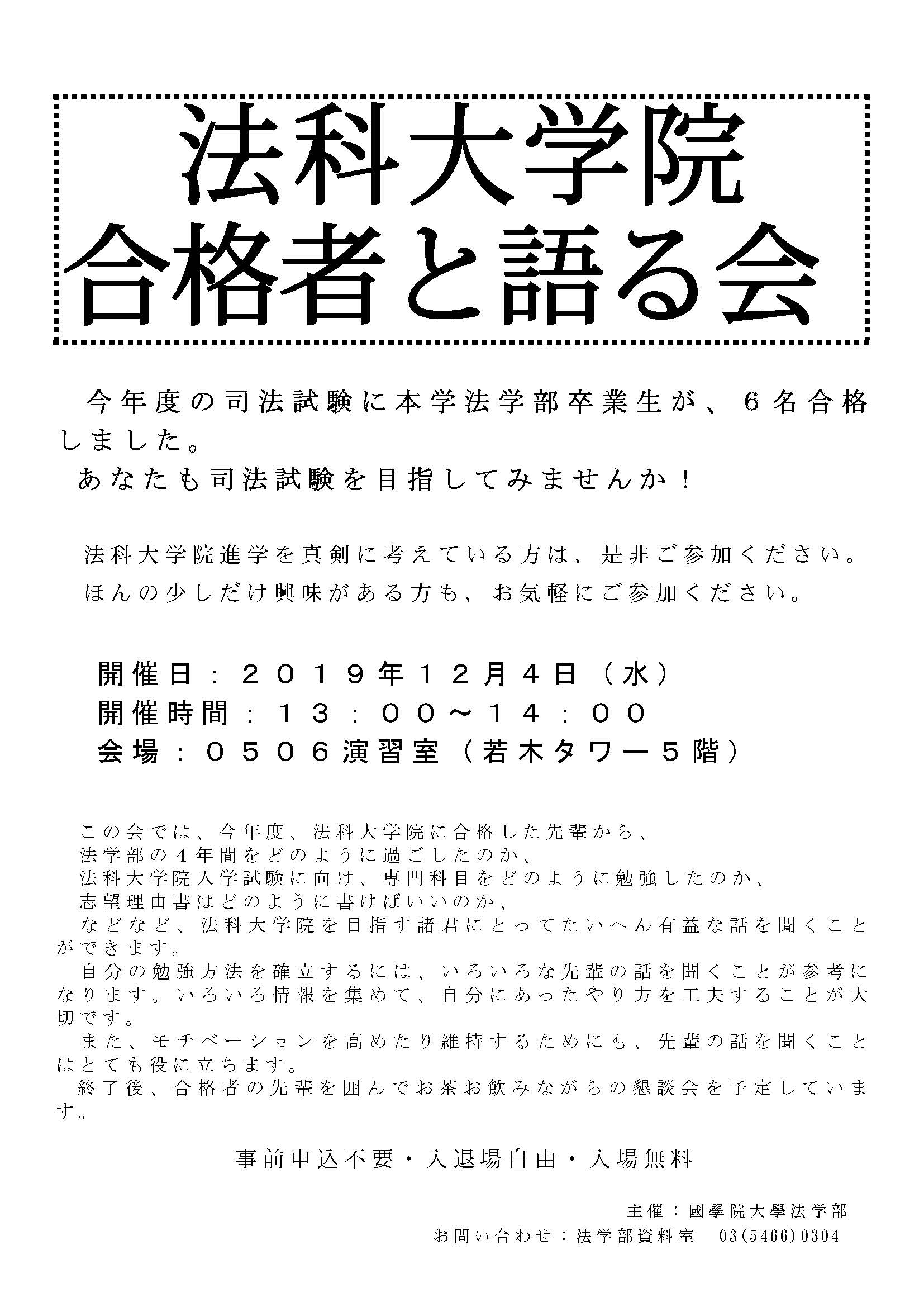 令和元年に、法科大学院に合格し進学を控えている学生が、下記の要領で、合格の秘訣等を語ってくれます。
