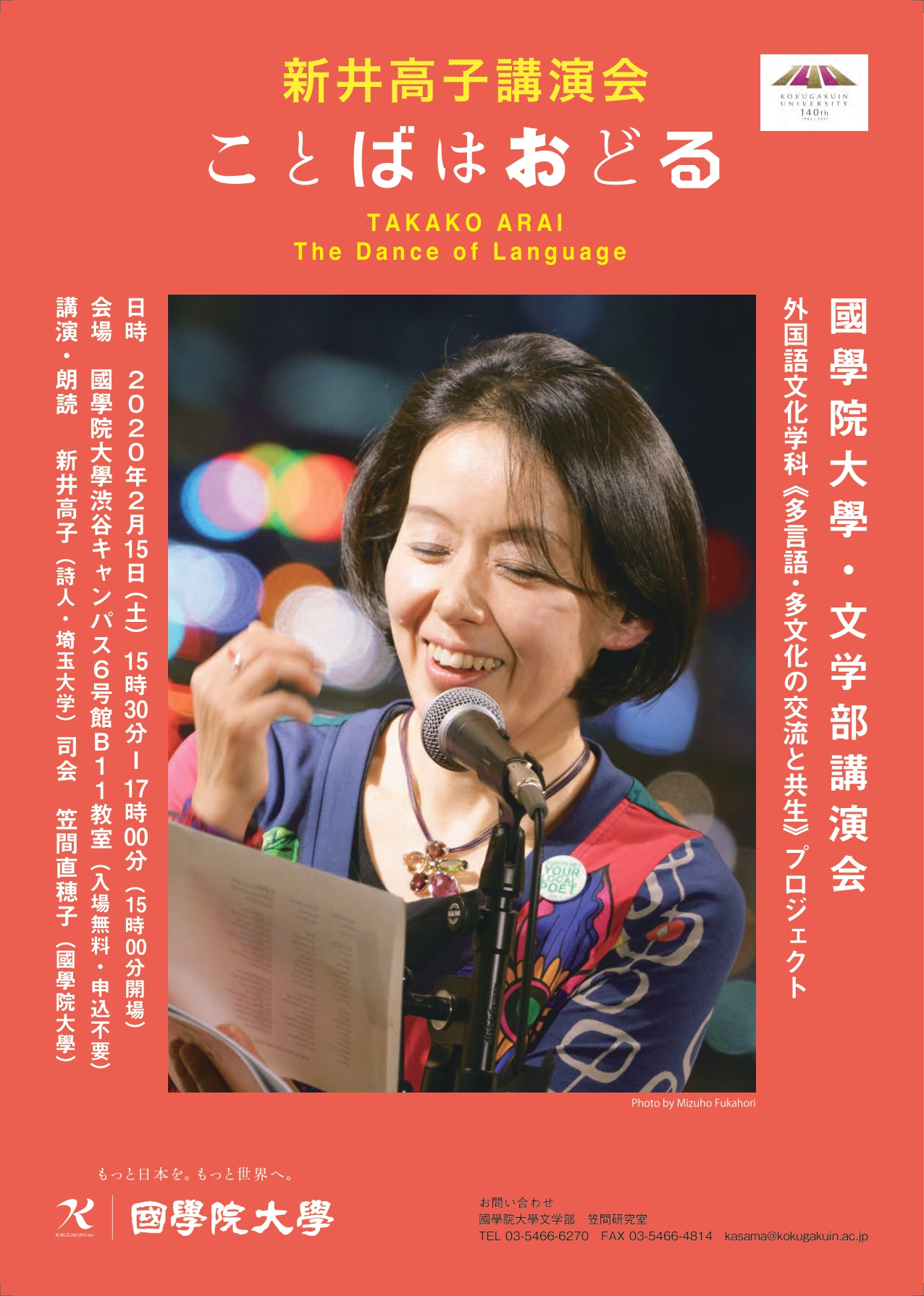 | 講師 | 講演・朗読 新井高子(詩人・埼玉大学) 司会 笠間直穂子(國學院大學) |