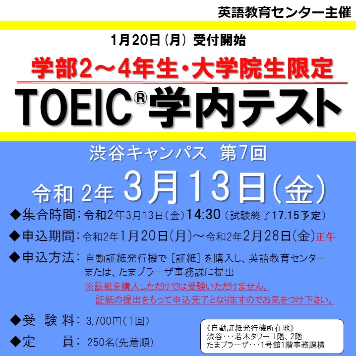 | 申込期間 | 令和2年1月20日(月)~令和2年2月28日(金)正午 ※自動証紙発行機で「R元年度TOEIC学内テスト(3/13渋谷)」の証紙を購入し、下記提出先へ提出してください。 ※証紙購入方法は、本ページ下部参照 |