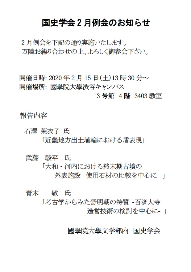 国史学会2月例会のお知らせ 全ての方向け Tweet 2020年1月21日更新 日時 2020年2月15日(土) 13:30~ 会場 渋谷キャンパス 3号館 4階 3403教室 問い合わせ 国史学会 文学部資料室(03-5466-0246) 国史学会2月例会を以下の通り開催いたします。 会員以外の方の来聴も歓迎いたします。 (参加費無料) 報告内容 石澤 茉衣子 氏 「近畿地方出土埴輪における盾表現」 武藤 駿平 氏 「大和・河内における終末期古墳の外表施設―使用石材の比較を中心に―」 青木 敬 氏 「考古学からみた舒明朝の特質―百済 大寺造営技術の検討を中心に―」 国史学会HP