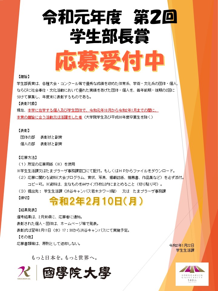 学生部では令和元年度第2回の「学生部長賞」を募集いたします。