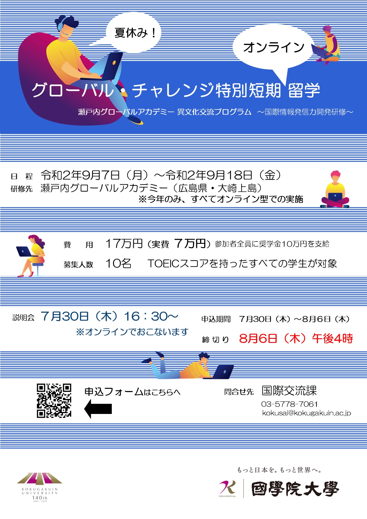 新型コロナウィルス感染症の収束時期が世界各地で見通せない状況を考慮し、本学では急遽、夏休みの留学に代わる、オンラインによる異文化交流プログラム「令和2年度グローバル・チャレンジ特別短期留学」の実施を決定いたしました。