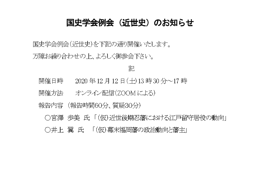 国史学会例会(近世史)を以下の通り開催いたします。