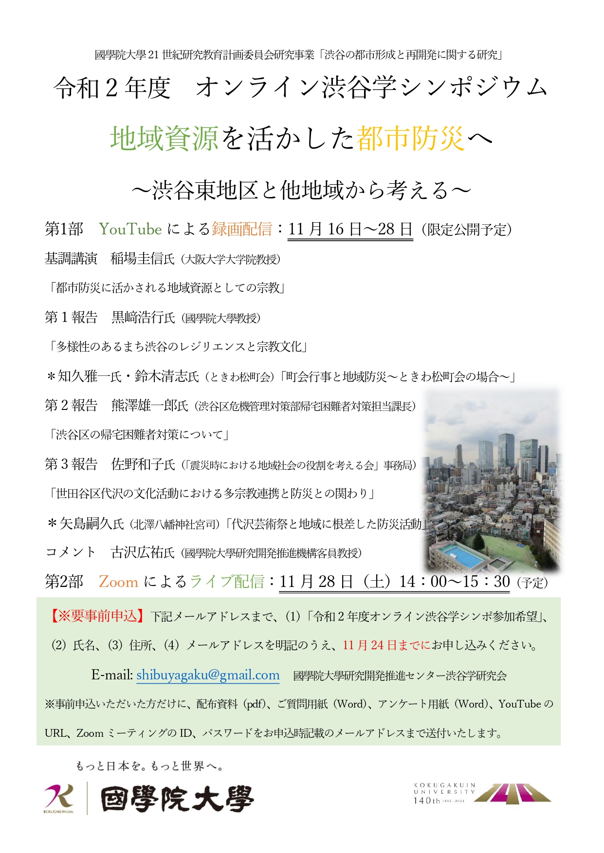 下記メールアドレスまで、(1)「令和2年度オンライン渋谷学シンポ参加希望」、(2)氏名、(3)住所、(4)メールアドレスを明記のうえ、11月24日までにお申し込みください。