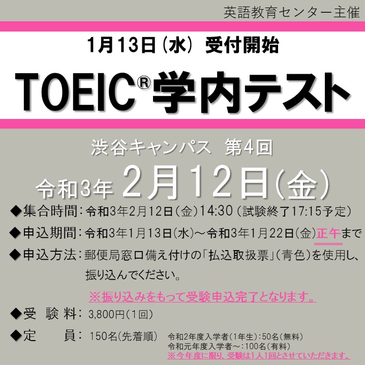 英語教育センターでは、令和3年2月12日(金)に第4回 TOEIC(R) L&R学内テスト(TOEIC IP)を実施いたします。