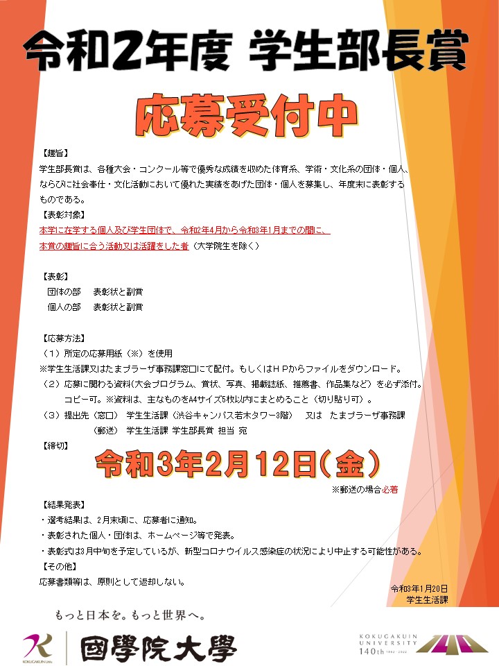 國學院大學 学生生活課 学生部長賞 担当 宛