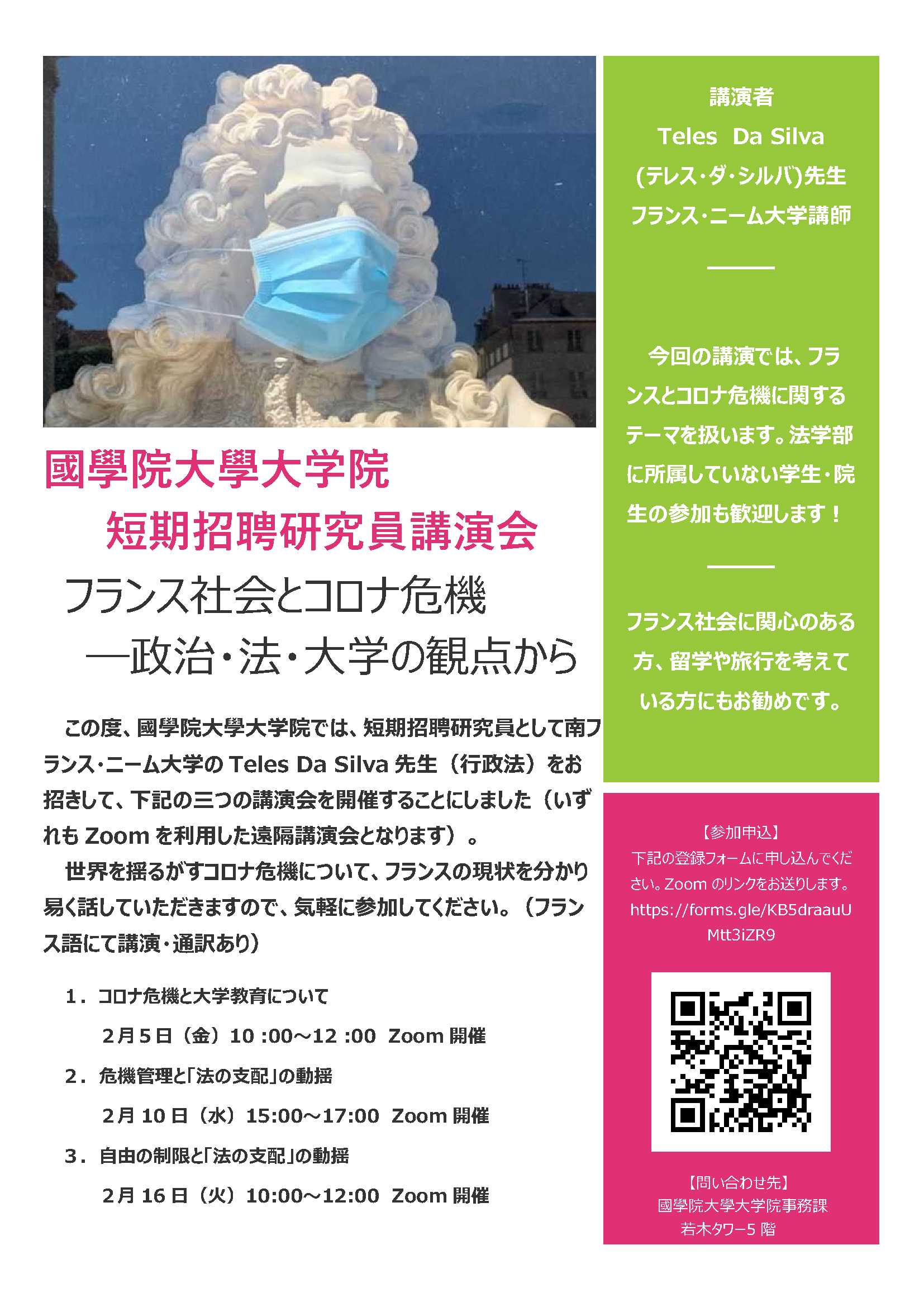 この度、國學院大學大学院では、短期招聘研究員として南フランス・ニーム大学のTeles Da Silva先生(行政法)をお招きして、下記の三つの講演会を開催することにしました(いずれもZoomを利用した遠隔講演会となります)。