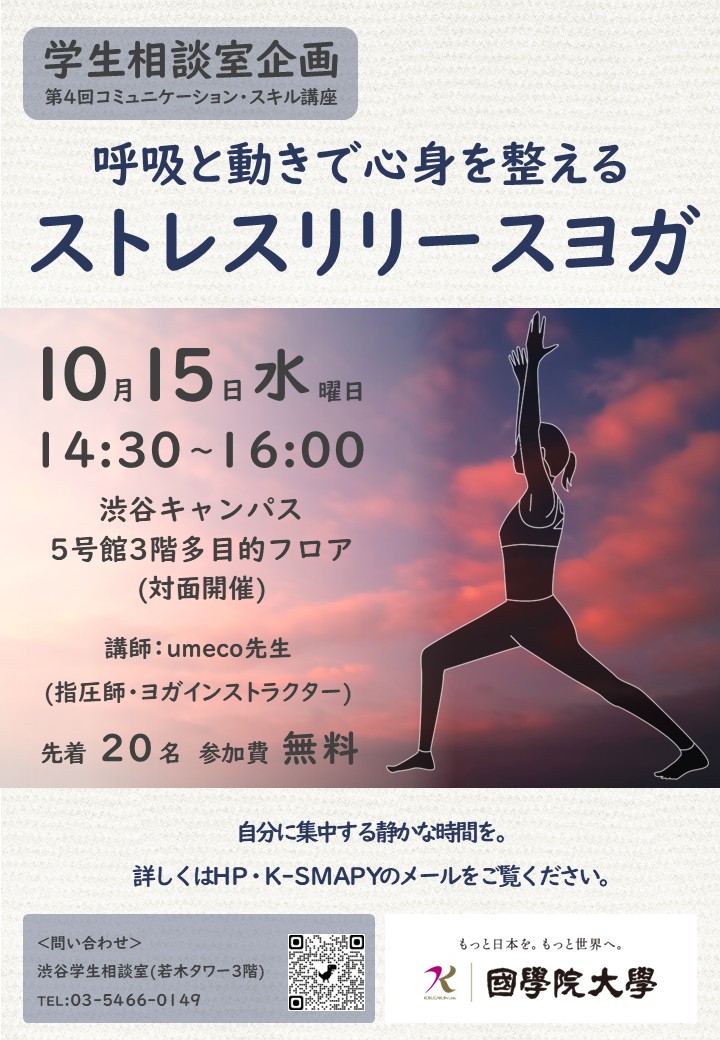 【募集開始】ストレスリリースヨガ <対面開催> 学生相談室企画 第4回コミュニケーション・スキル講座