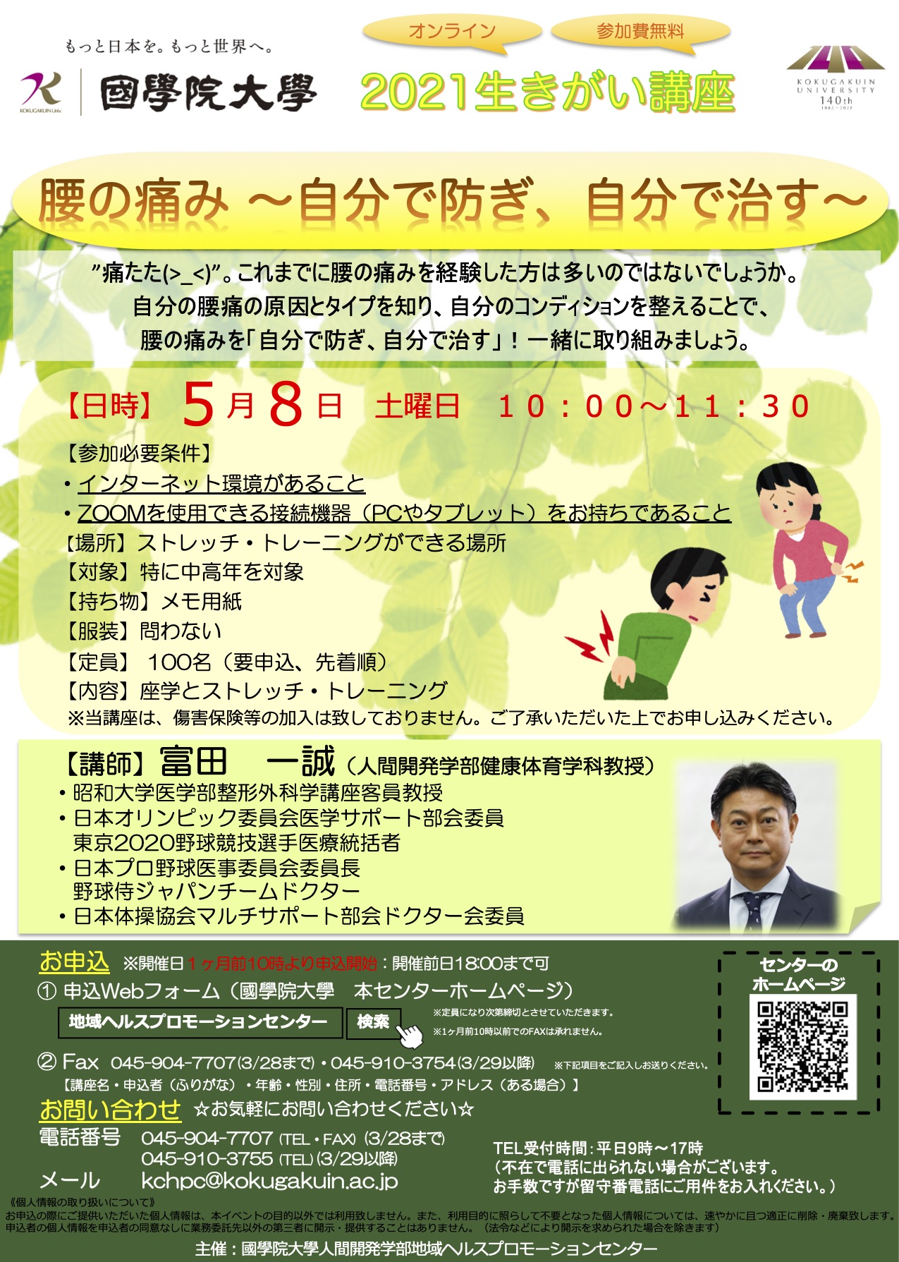 申込みを締め切りました. たくさんのご参加,ありがとうございました. オンライン生きがい講座 「腰の痛み ~自分で防ぎ、自分で治す~」