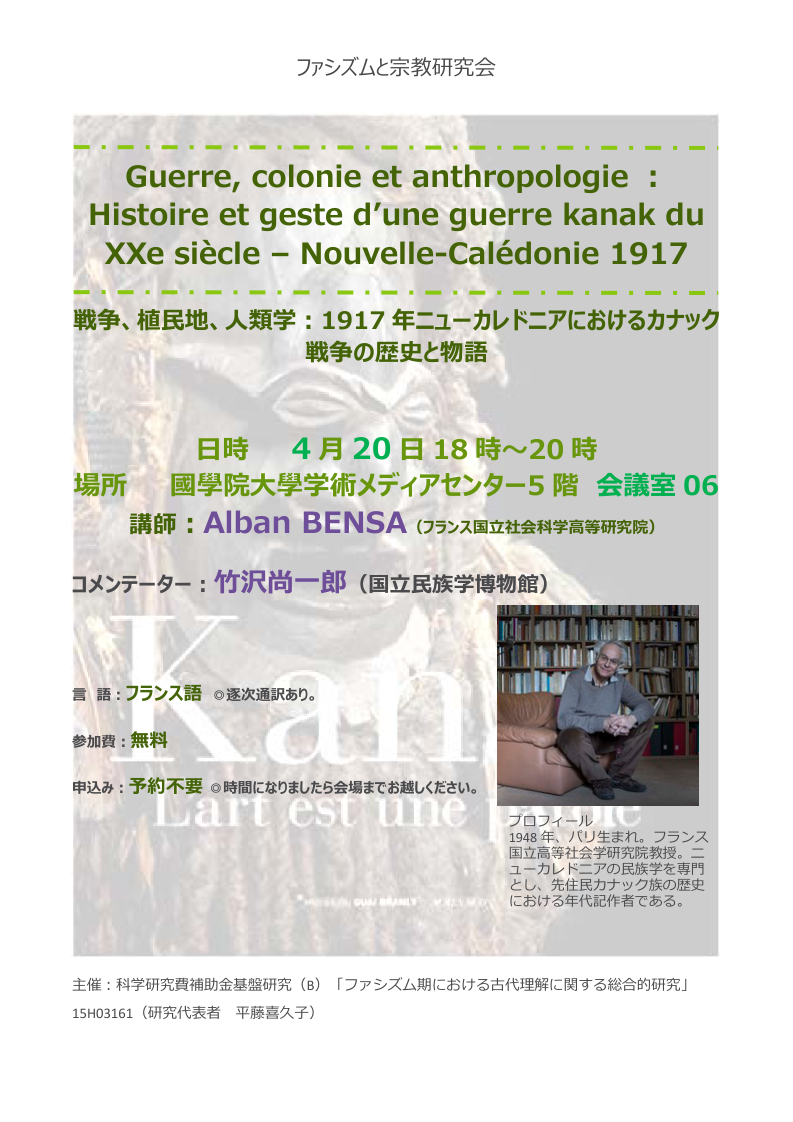 講演者:Alban BENSA(フランス国立社会科学高等研究院) “Guerre, colonie et anthropologie : Histoire et geste d’une guerre kanak du XXe siècle – Nouvelle-Calédonie 1917.” コメント:竹沢尚一郎(国立民族学博物館) |