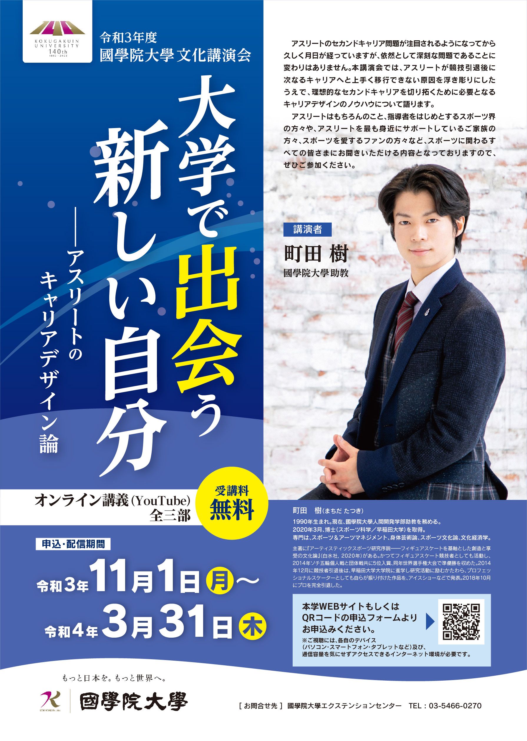 「大学で出会う新しい自分ーアスリートのキャリアデザイン論」と題し、理想的なセカンドキャリアを切り拓くために必要となるキャリアデザインのノウハウについて、國學院大學人間開発学部の町田 樹助教にご講演いただきます。